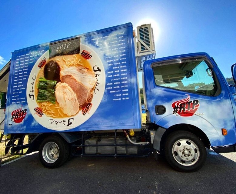 全面ラッピングは鳥取の青空と我々の夢だった鳥取の小麦畑をメインに RTP らーめんの全面写真とロゴ、RTP メンバー、協力頂いた仲間たち、支えて頂いたみなさんの名前をデザイン 致しました。