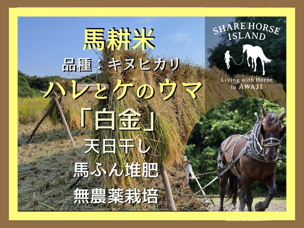 こちらの「さくっと馬耕たんぼ」でとれたキヌヒカリのお米を馬耕米 ハレとケのウマ「白」としています。