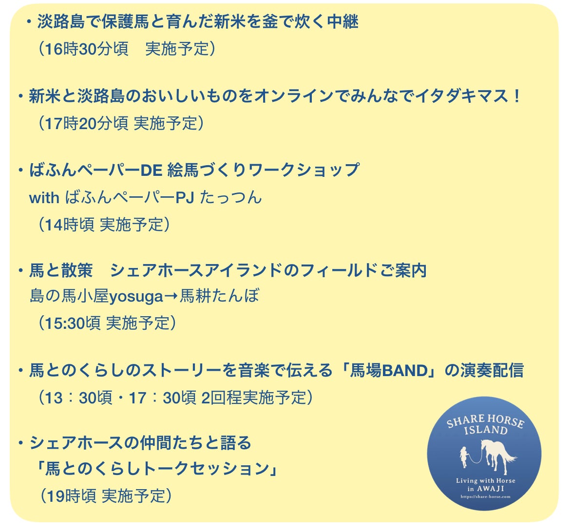 また、今回このプロジェクトを知って頂くのと、馬と育てたお米の収穫を感謝するために、収穫祭イベントを行うことにしました。コロナ禍の影響もある為 今年はオンラインでの開催になりますが、オンラインならではの楽しいコンテンツを仲間たちと企画しています。