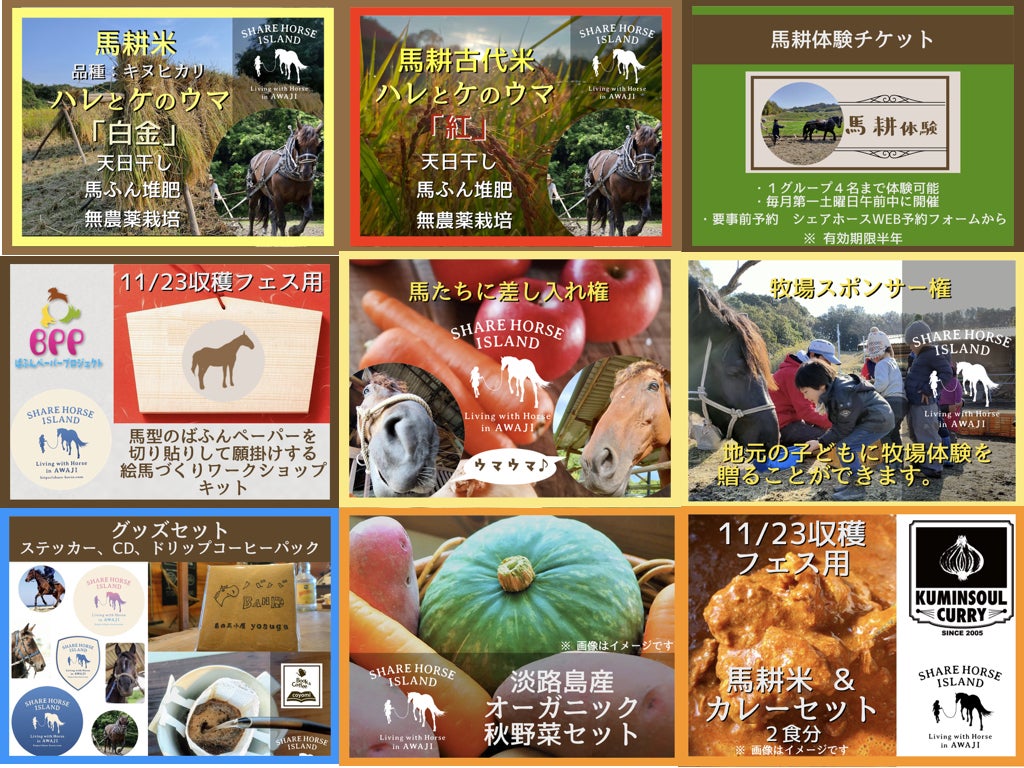 馬と育んだお米「ハレとケのウマ」はもちろん、シェアホースのオリジナルグッズや体験チケット、また淡路島の仲間たちが提供してくれる品々を返礼品としてご用意しています。