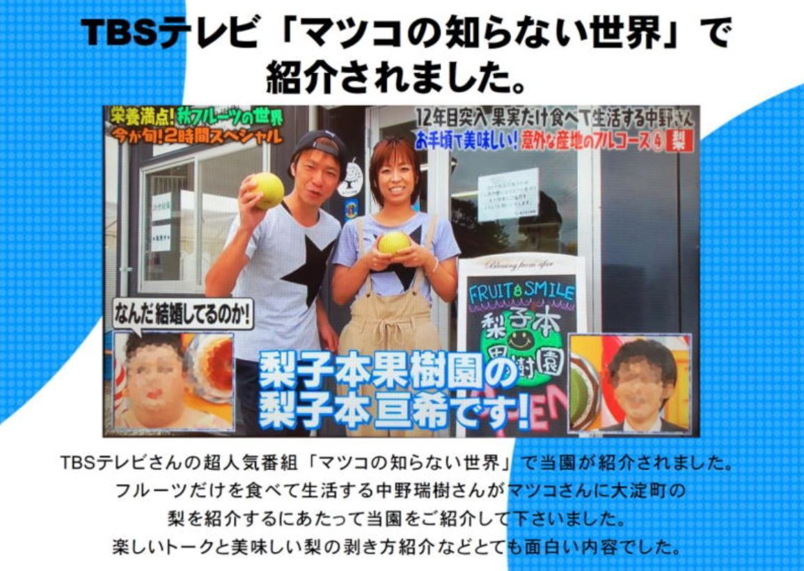 【マツコの知らない世界】で僕の梨が取り上げられました。フルーツだけを食べて生活している中野瑞樹さんという方が、「今まで食べた梨の中で一番美味しい!」とご紹介して下さいました。
