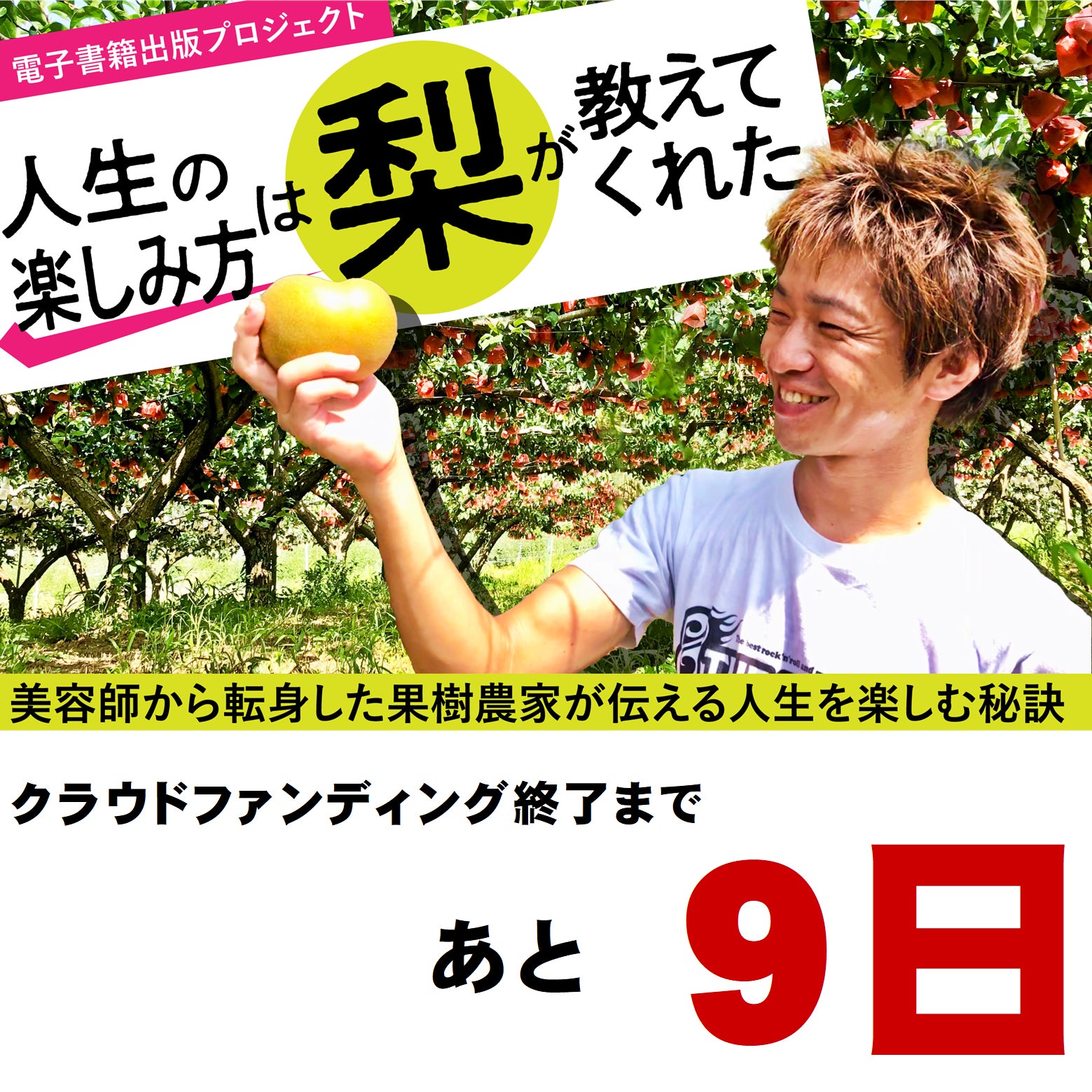 2021/09/29 06:558月10日から始まったクラウドファンディングの挑戦も今日がいよいよ最終日!僕はとにかく「後悔をしたくない生き方」をしたいと思い日々を生きています。ああしておけば良かった。こうしておけば良かった。という事を極限まで無くす為に、その時その時に今の自分ができる事を精一杯するように心掛けています。それは「自分の子供に胸を張れる生き方」と言えると思います。何も難しい事ではなくただただ自分の子供に「今日、お父さんはこういう1日を送ったんだよ」と正直に話せる毎日を過ごすという事です。めちゃくちゃ簡単な事ですが、大人というのはそれが結構難しかったりします。騙したり、裏切ったり、サボったり、、、仕事したり生活していると子供に正直に話せない事って結構多いものです。誠実に生きることはなかなか難しい。その生き方って楽しくないと気づかせてくれたのが果樹農業という仕事でした。そこで得たマインドを、有名人や著名人では無い、ただただ一般人の僕が伝えるからこそストレートに感じてもらえるのではないかと思いこのプロジェクトを立ち上げました!過去は変えられないですが、未来は変えられます!!前を向く事に疲れた方の背中をそっと押せたり、道に迷いかけている方の小さな道標となれる本を出版したいと本気で考えています!賛同して頂ける方がいましたら是非応援よろしくお願いします!! もっと見る