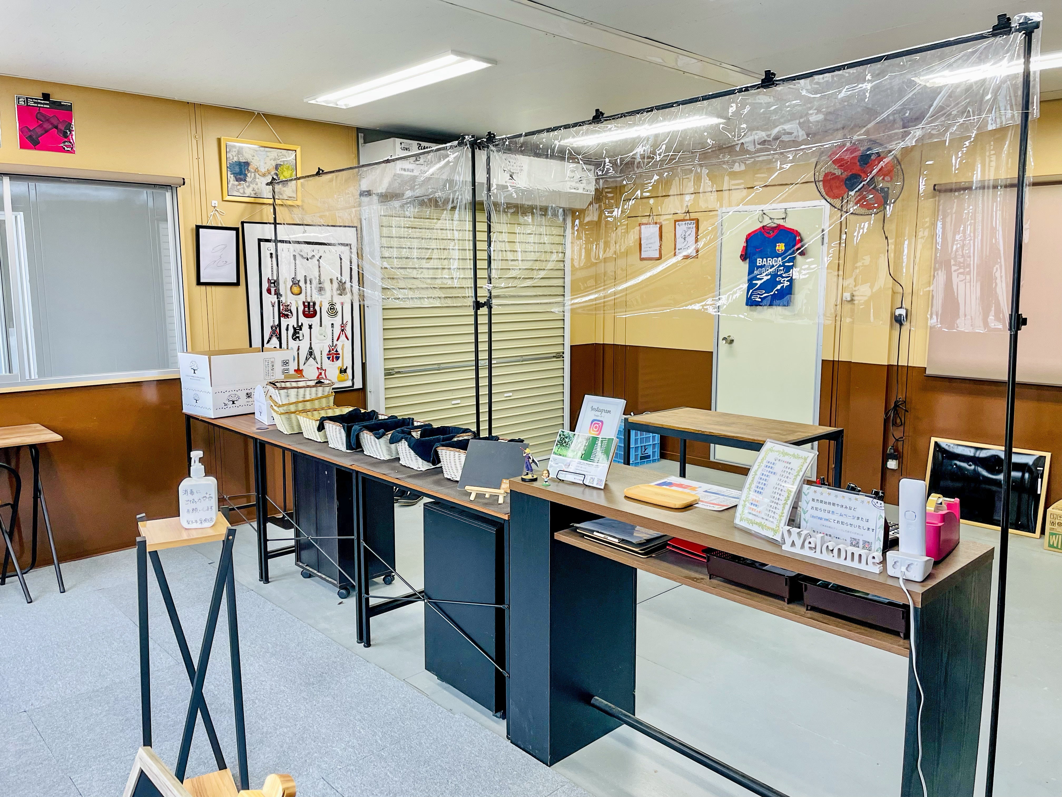 お客さんとスタッフが少しでも安全に梨を購入して頂けるようにコロナ対策として飛沫ガードシートと消毒棚を設置しました。