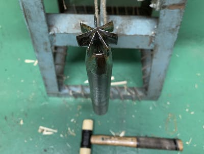 そこから割という作業に入ります。刃の付いた台にカットした黒文字を押し当てハンマーで叩き割ります。自然に生えた生木を割るということで木の筋、曲がりなどがあり機械化が難しく これも今でも手作業で仕上げていきます。
