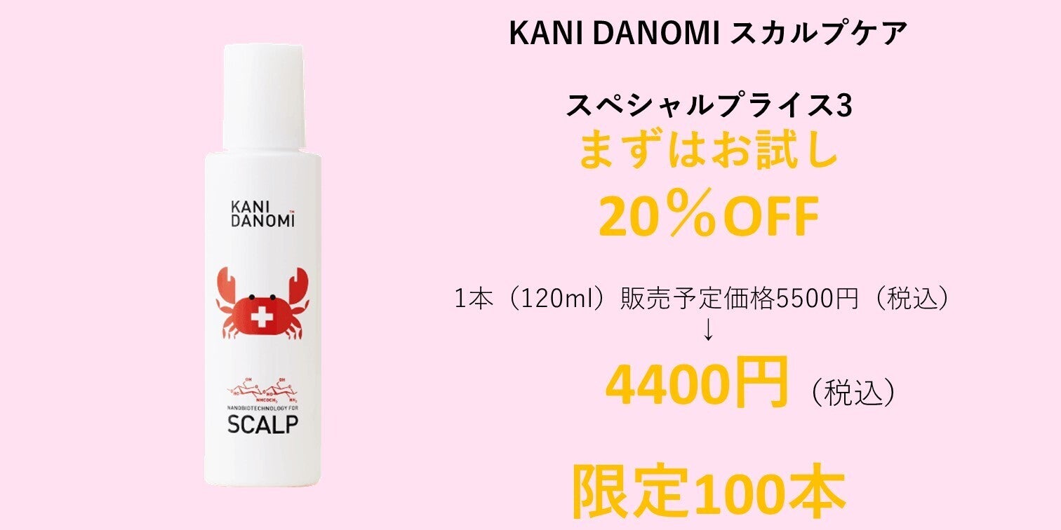 今回、新たに生まれ変わったKANI DANOMI スカルプケアをより多くの方にお試しいただき、「粉ふき白色頭皮」から「透明感のあるうるおい青白頭皮」へと導くお手伝いができればと、リニューアル記念価格でご提供いたします。ぜひ、この機会をお見逃しなく!!