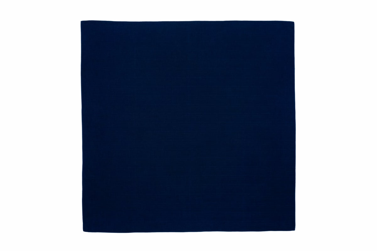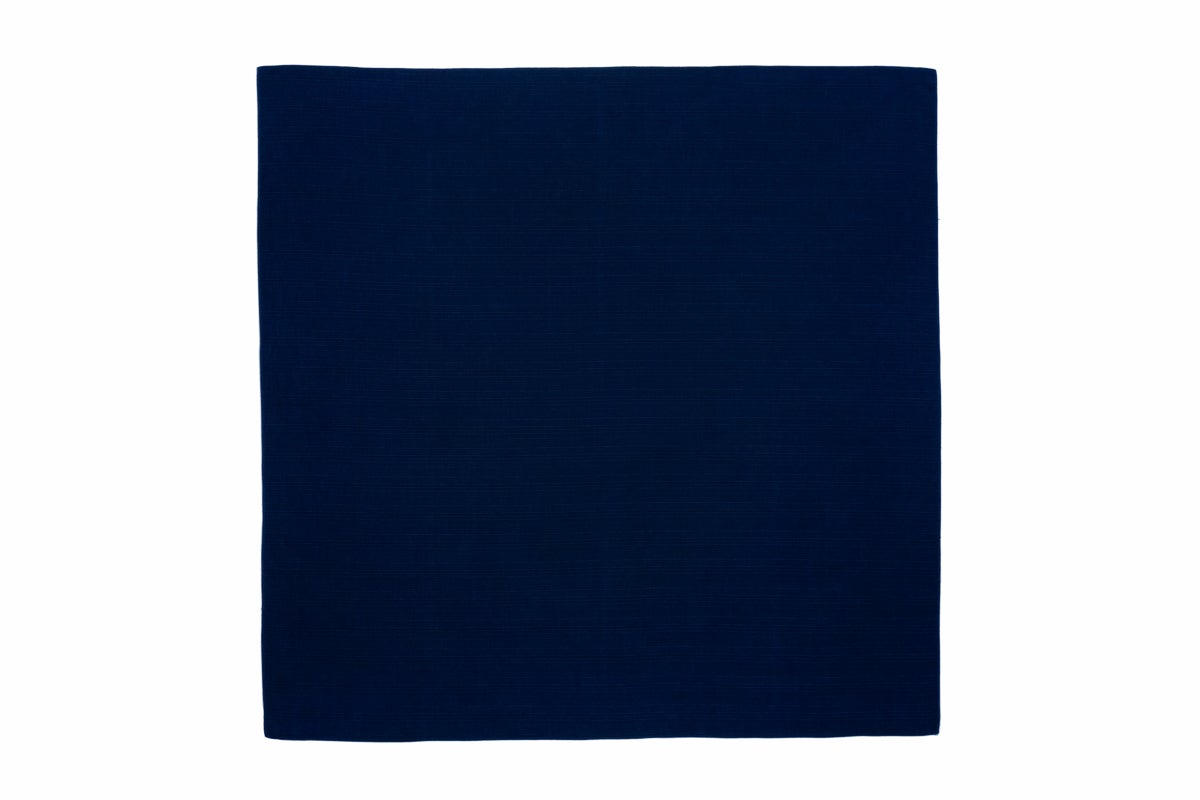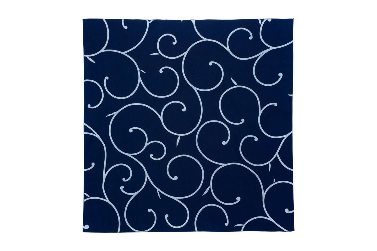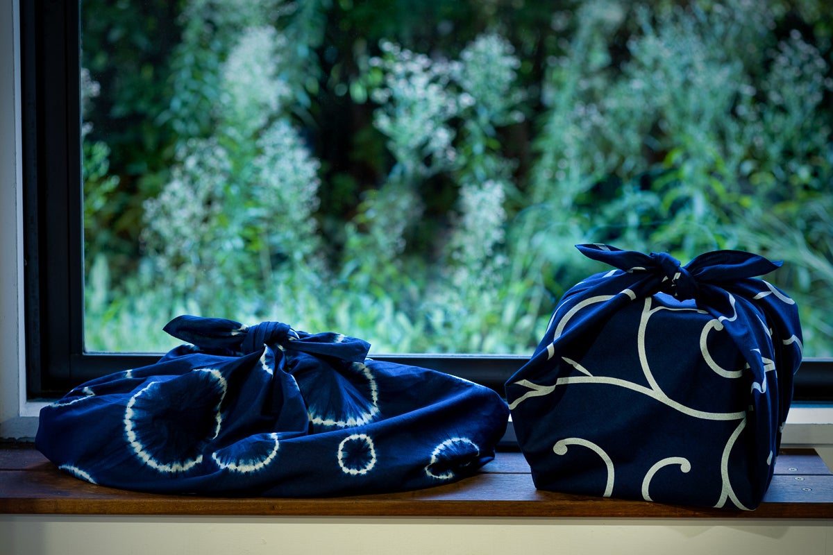 今回は、徳島県藍住町にて、国選定の阿波藍無形文化財、現代の名工の製造するすくもを使用し、江戸時代から伝わる伝統技法による化学薬品を使用しない染色方法の本藍染で風呂敷を製作いたしました。