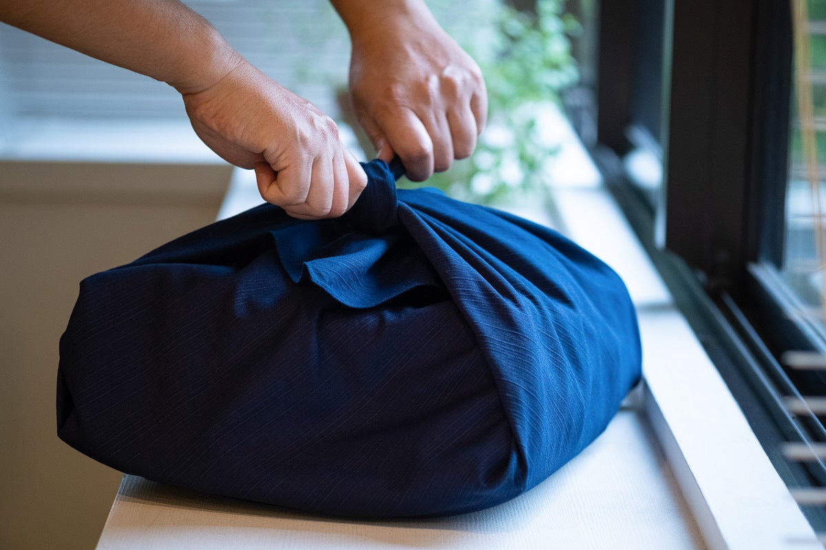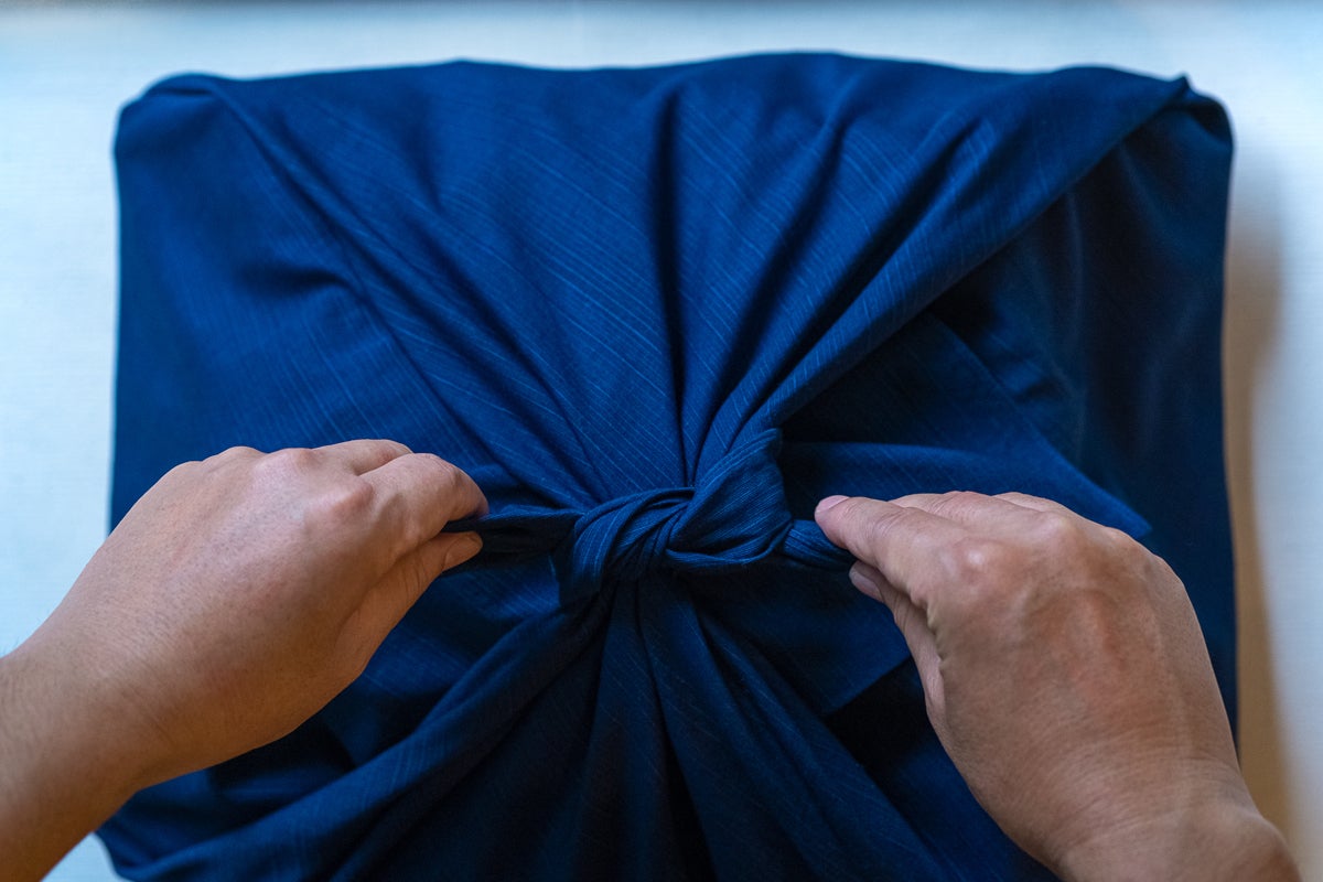 日常的な使い方は、包みたい物を中央に置いて、布の端と端を結ぶ。とてもシンプルです。