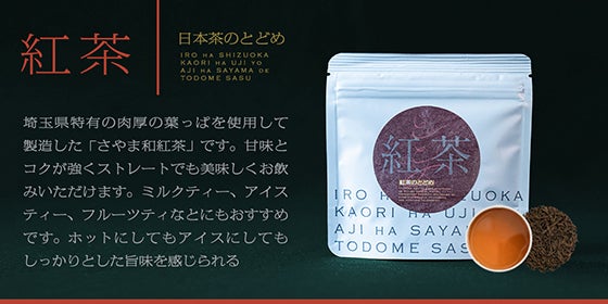 埼玉県特有の肉厚の葉っぱを使用して製造した「さやま和紅茶」です。甘味とコクが強くストレートでも美味しくお飲みいただけます。ミルクティー、アイスティー、フルーツティなとにもおすすめです。 ホットにしてもアイスにしてもしっかりとした旨味を感じられます。
