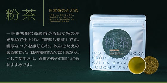 一番茶初期の高級茶から出た粉のみを集めて仕上げた「深蒸し粉茶」です。濃厚なコクを感じられ、飲みごたえのある味わい。お寿司屋さんでは「あがり」として使用され、食事の後の口直しにもおすすめです。一般的に粉茶は安価と思われがちですが、ここで使用する粉茶は厳選されたもののみを使用しています。