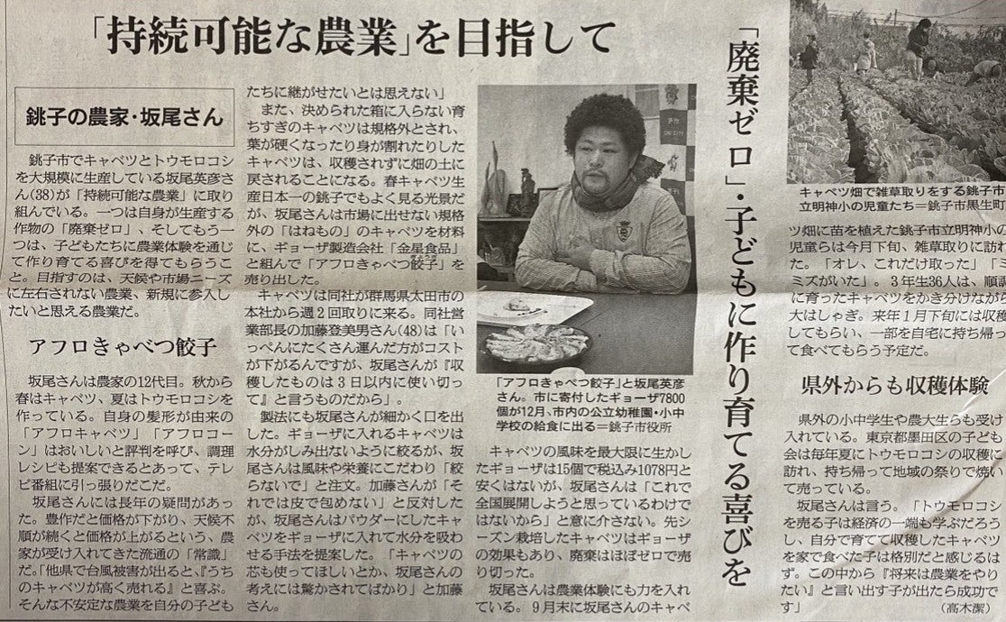 ★銚子市学校給食へのアフロきゃべつ餃子 10,000粒寄付