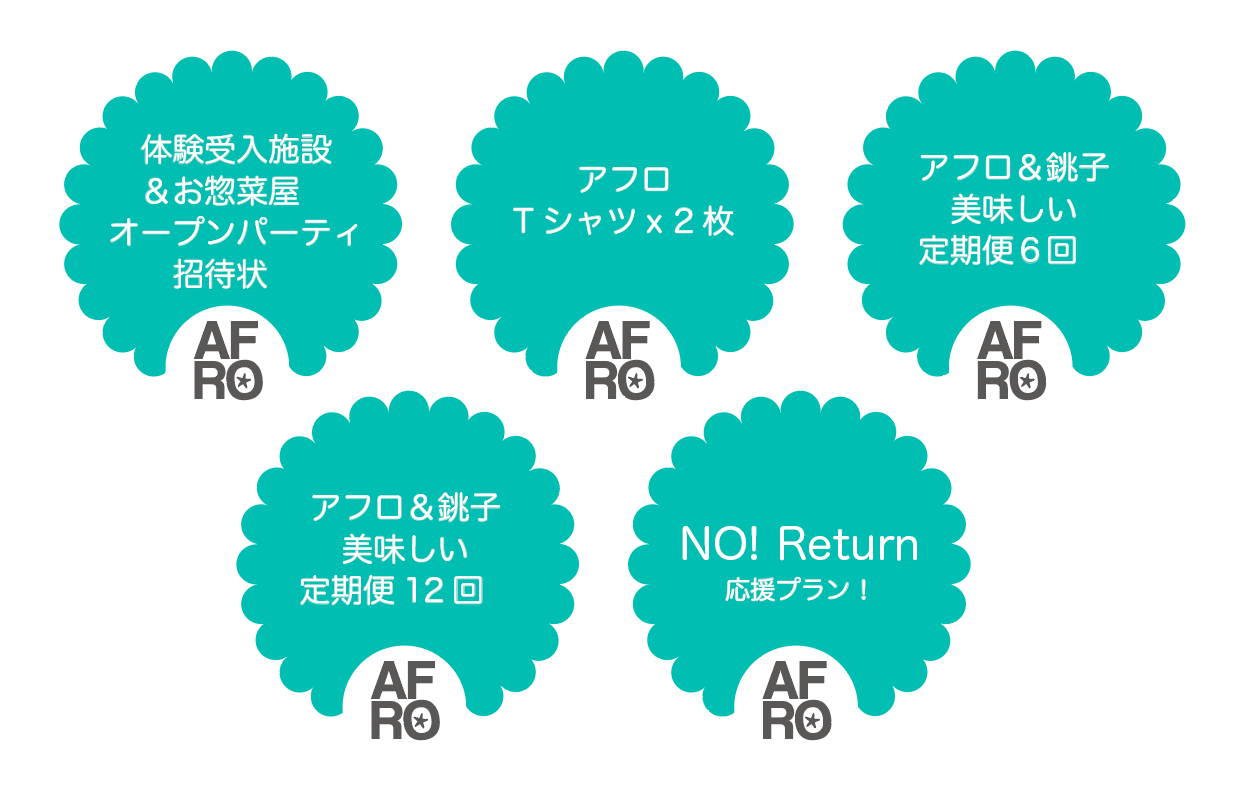 魅力的なリターンを追加させて頂きました!追加でのご支援なども可能なのでよろしくおねがします。1、Hennery Farm オリジナルTシャツ2枚セット今までなかったオリジナルグッズ!アフロマークとロゴにある 芽 を手作業で1つずつ印刷しています。ボディは4オンス!サイズはSMLXL!薄手のTシャツはインナーとしてや夏に涼しいのでアフロも愛用!2、アフロ&銚子 定期便 6回食料自給率240%の銚子の恵まれた食材の中から 旬 の食材をお届けします!Hennery Farm商品とのレシピや美味しい食べ方の提案あり例:アフロきゃべつ と いわしのつみれ → きゃべつつみれ汁3、アフロ&銚子 定期便 12回食料自給率240%の銚子の恵まれた食材の中から 旬 の食材をお届けします!Hennery Farm商品とのレシピや美味しい食べ方の提案あり例:アフロきゃべつ と いわしのつみれ → きゃべつつみれ汁4、体験受入施設&お惣菜屋 オープンパーティ招待状今年の春のオープンを目指す、体験受入施設&お惣菜屋 オープンパーティ招待状です。施設の見学と銚子食材を使った料理も用意したオープンパーティーです。*招待券は数量限定とさせて頂きます。