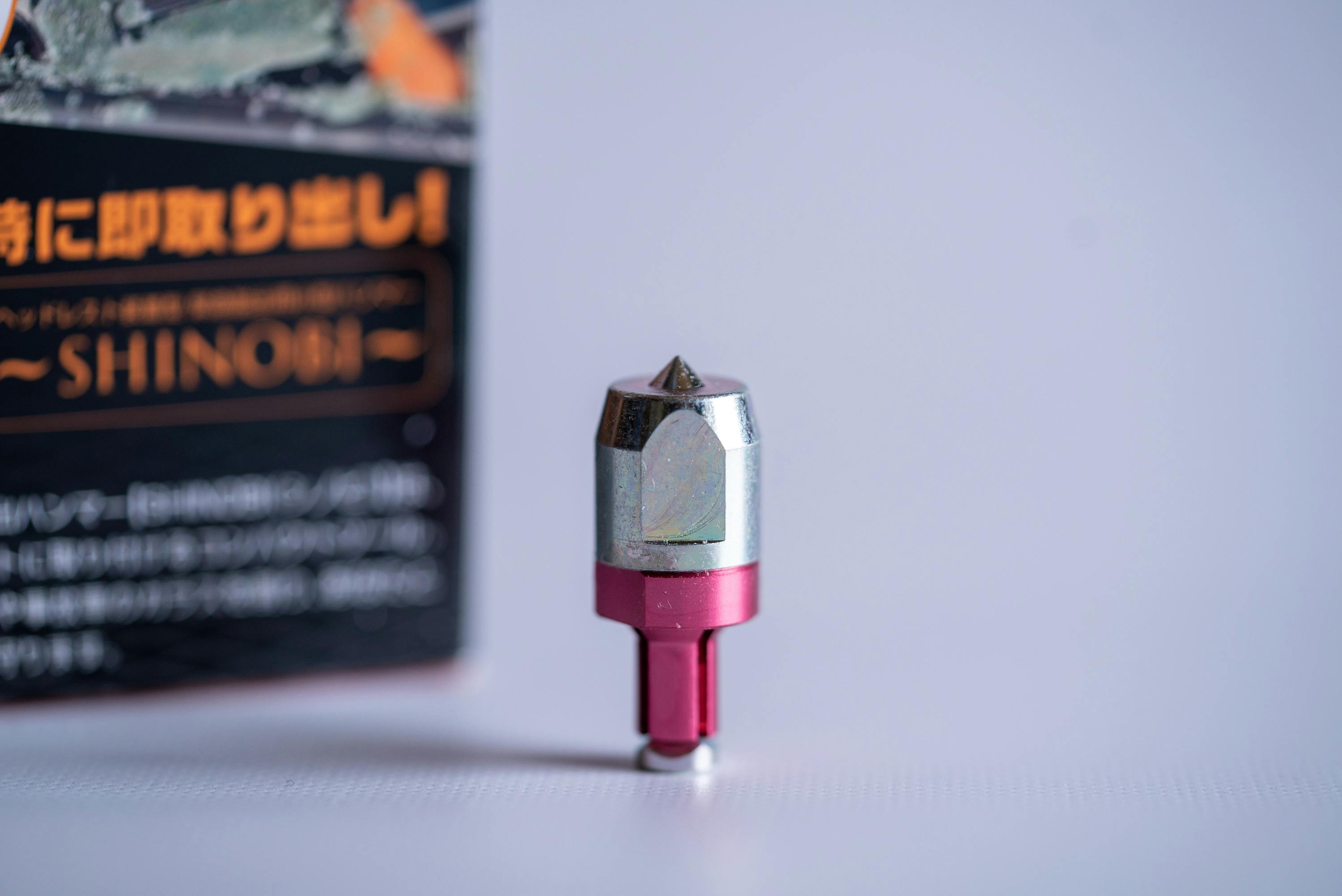 ヘッドレストを外し先端に取り付けられたSHINOBIをガラス窓に垂直に突起部分を当てることで、いとも簡単に割ることができます。