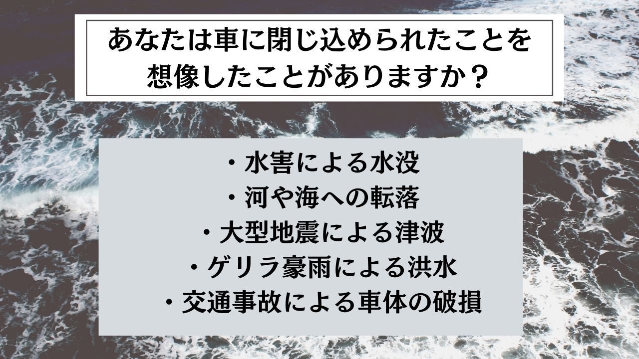 交通事故などの場合は破損した窓やドアが開かない、ということがありますし、水没の場合も電気系統が使用できなくなり窓が開かなくなってしまいます。