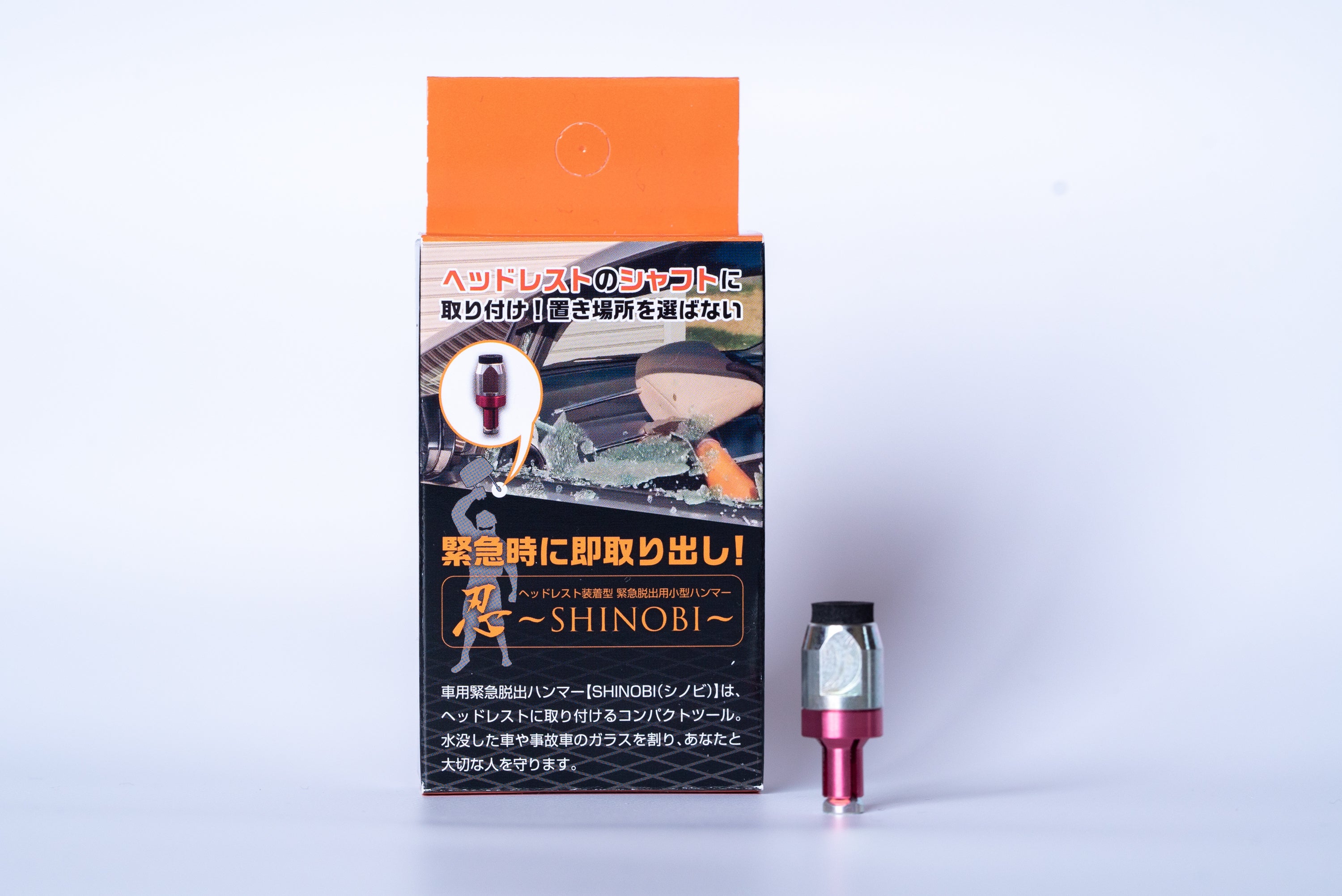 車用緊急脱出ハンマーSHINOBI(シノビ)は、ヘッドレストに取り付けるコンパクトツールとなります。