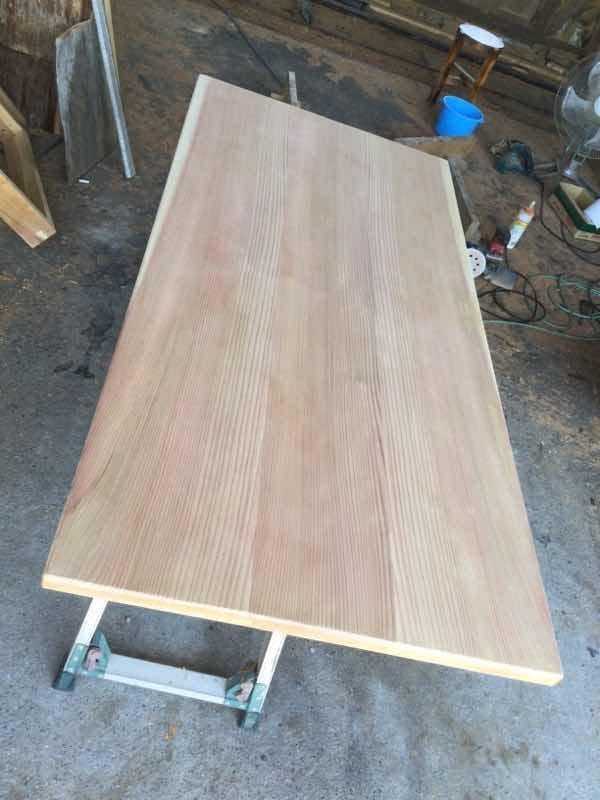 本日スタートしましてご支援ありがとうございます。今日は数年前に納めさせていただきましたパソコンデスクとダイニングテーブルのリサイズ作業をしてました。どちらも三河杉の柾目をはぎ合わせた天板です。長さをカットしてサンディングしますとまた美しい木肌が蘇ります。ダイニングテーブルはソファーに合わせたローテーブルに、パソコンデスクは新たに脚を作って小ぶりになりました。ライフスタイルに合わせて再度加工ができるのが木材の素晴らしい所だと思います。