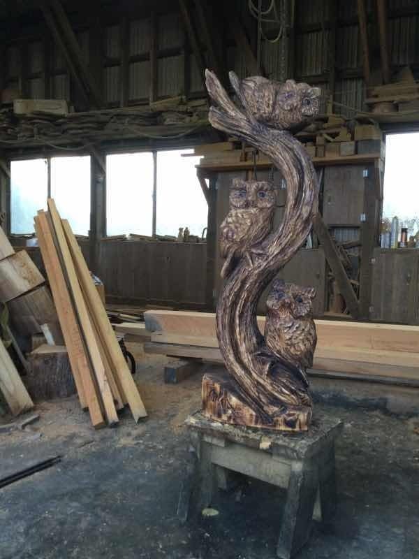 今日は以前にご購入頂いたフクロウの焼き塗装仕上げをしました。始めは木の香りを楽しんで頂いてそこから焼き塗装仕上げをしてと2度楽しめるのもチェーンソーアート作品の魅力です。リターン用の作品は乾燥後に焼き塗装仕上げをした品物になります。