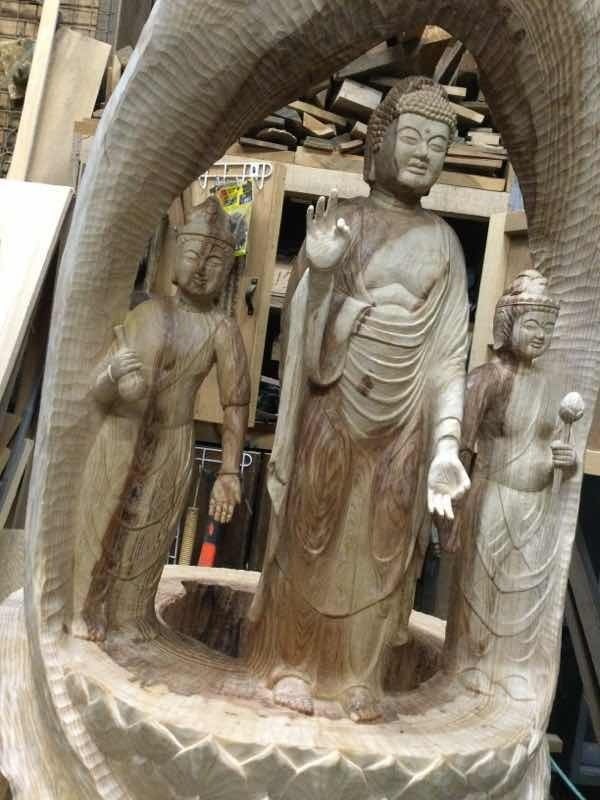 一年がかりで運搬、製材、六地蔵、お盆とこなしましたが、メインの阿弥陀像がようやく完成しました。なかなか手強い松でしたが良い作品になったと思います。