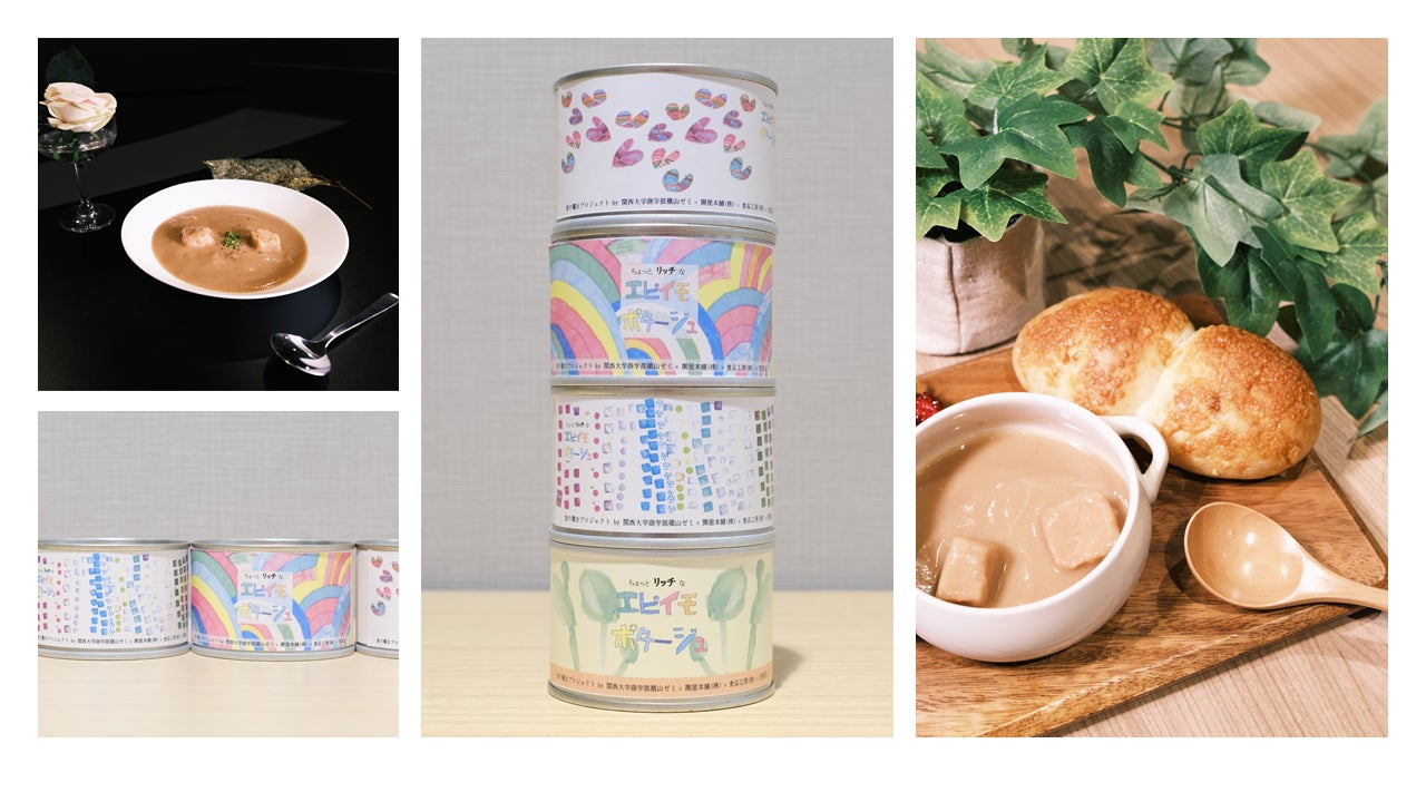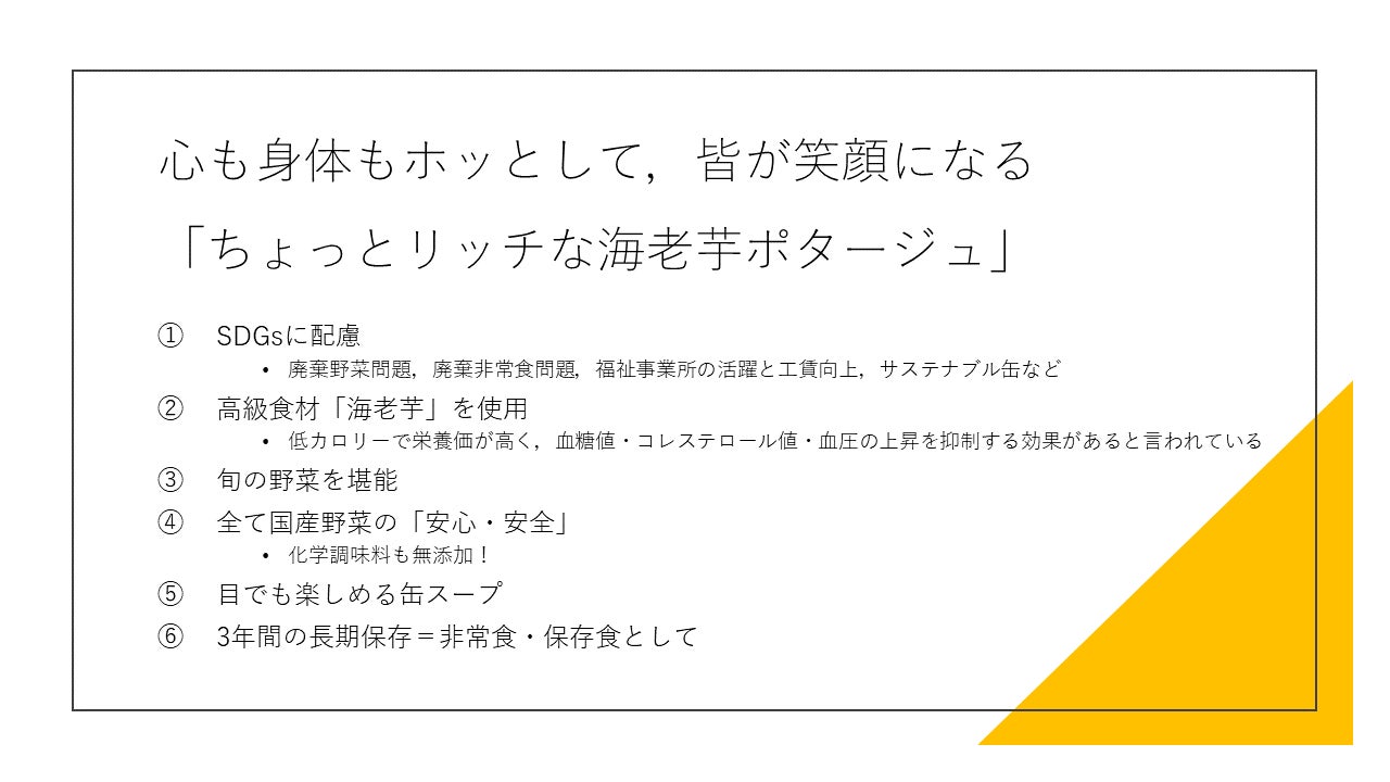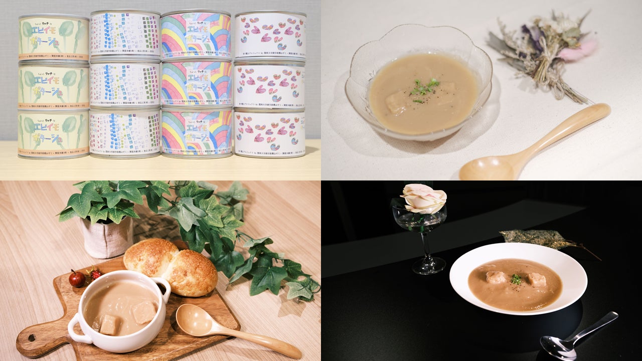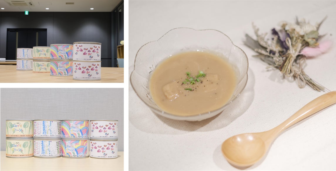 非常時・災害時に人々の命とココロを救うことができる,非常食の缶詰スープ(3年間の長期保存可)として「ちょっとリッチな海老芋ポタージュ」を開発しました。