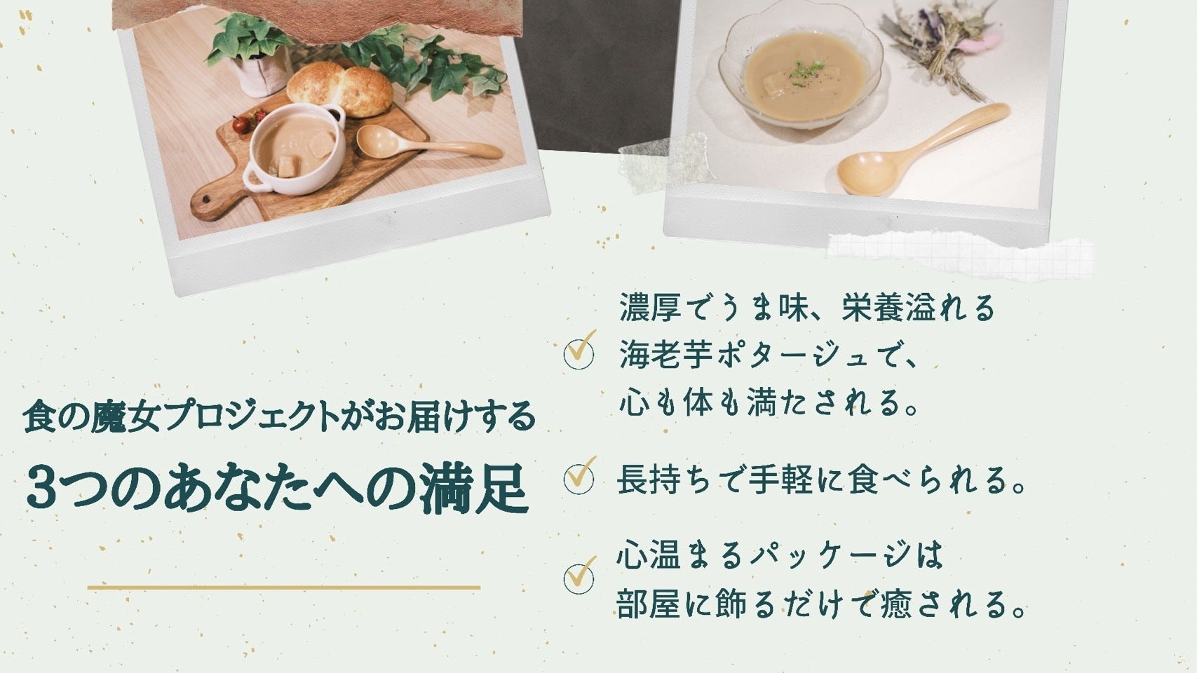 私達の「食の魔女」プロジェクトでは,この「ちょっとリッチな海老芋ポタージュ」の販売を通して, ①産地廃棄野菜問題,②非常食の廃棄問題,③障がい者の働き甲斐と工賃問題といった3つの社会問題を解決し,皆が笑顔になる社会を実現したいと考えています。