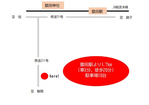 猿田駅より1.7㎞。車で3分。徒歩20分です。