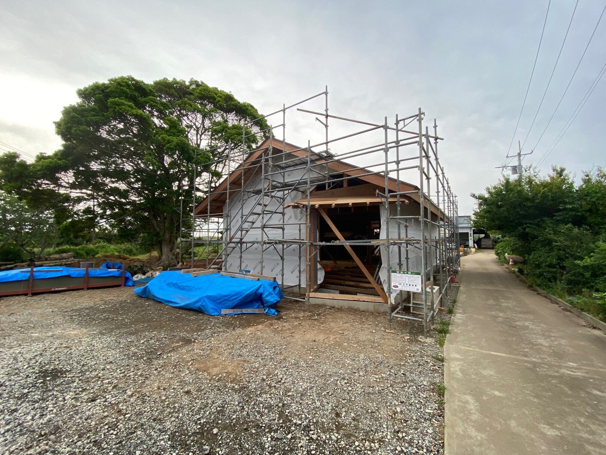 昨日、あっという間に屋根が半分張り終わっていました!正面からでは、屋根が写りにくかったので、裏からの写真です。(ビニールハウスが写りこんでしまいました)ちなみに、写真の下の方にある丸い蓋のようなものは、店舗が県道に面しているため、浄化槽の水が側溝に流せないそうなのです。そのため、自分の所有する土地の中で処理しなくてはいけない、ということで追加することになった、「蒸発散装置」というものです。お値段100万円以上!建設を計画していると、思わぬ出費がたくさん出てきますが、くじけずにに頑張ります!今日は壁の作業をしていました。毎日どんどん進んでいきます!!