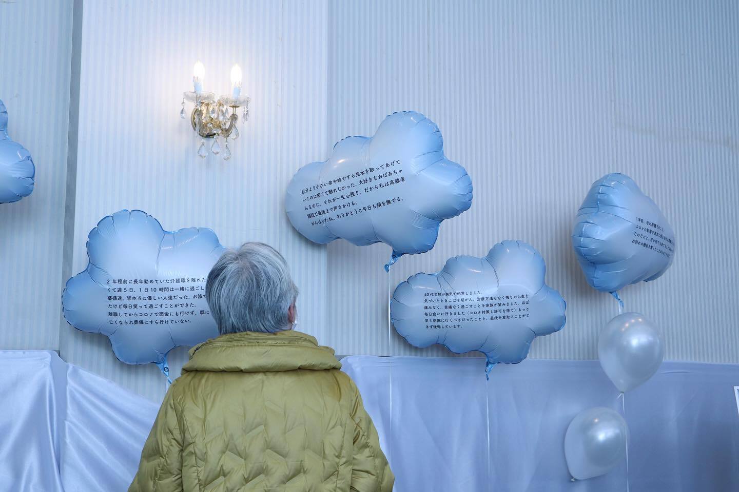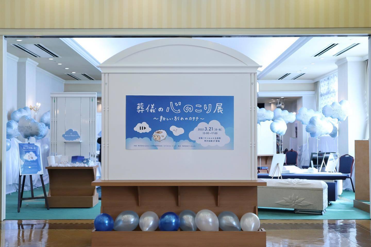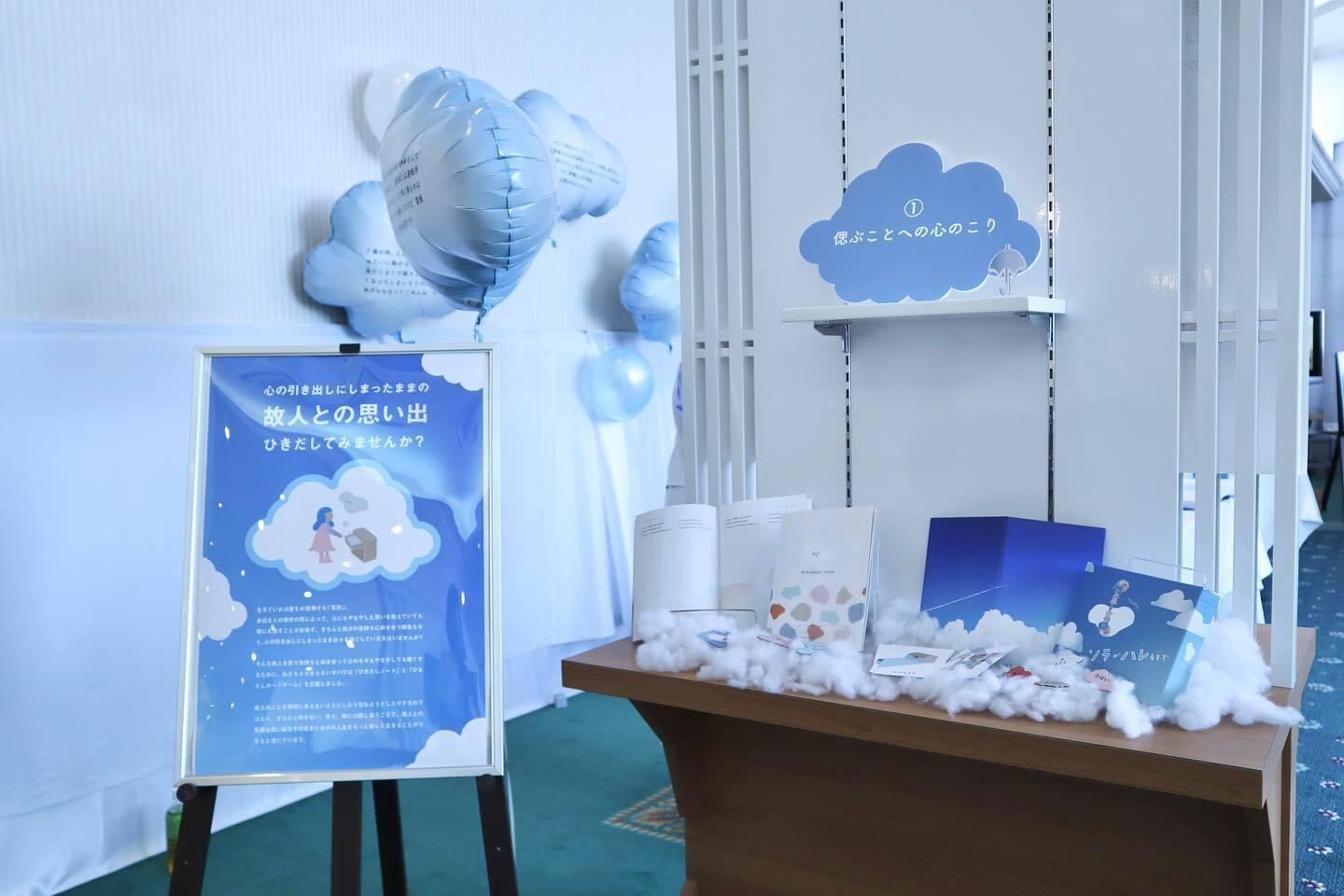 みなさまから集めた「葬儀の心のこり」を雲のバルーンで展示。"弔えなかった心のこり"を残さないためにできることとして、カードゲームやノートを展示し提案しました。