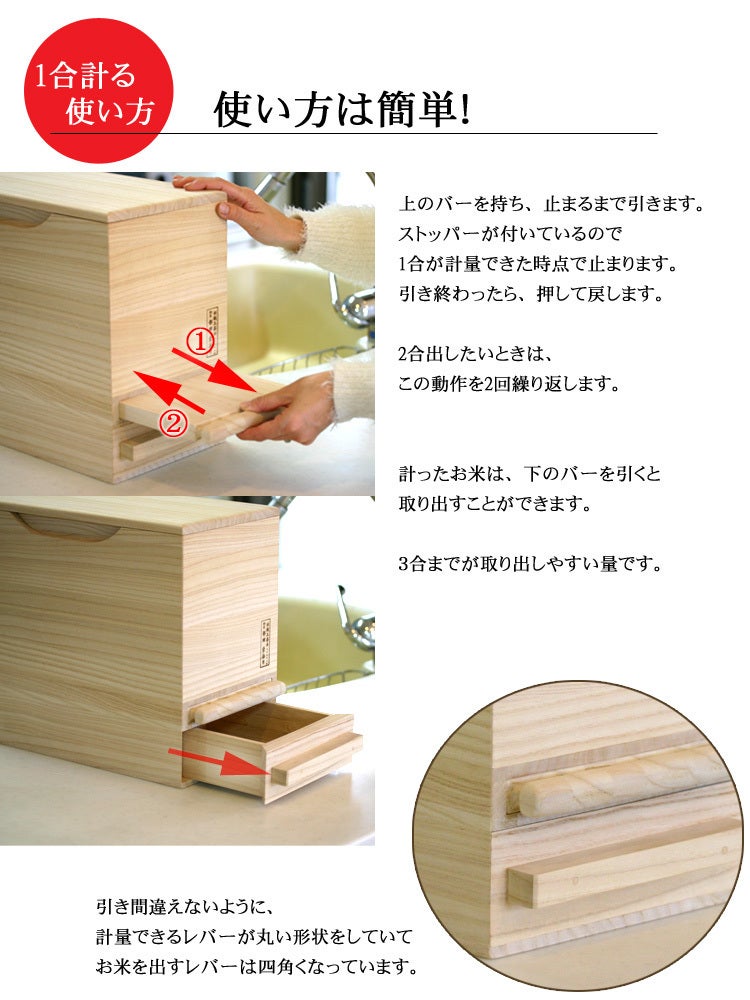 レバーを1往復させると下のひきだしに一合が落ちる仕組みになっており簡単に計量できます。
