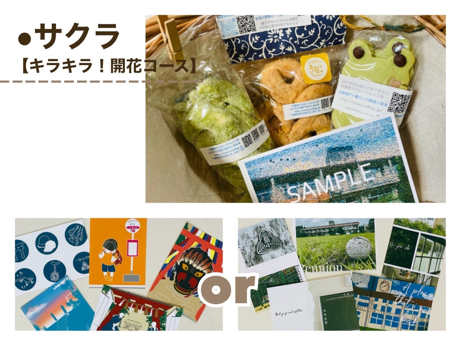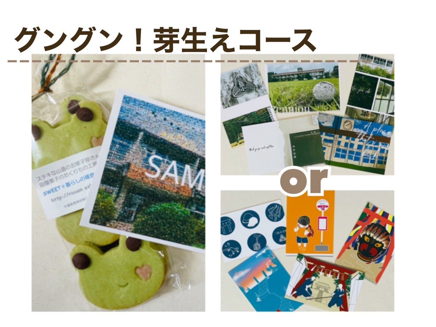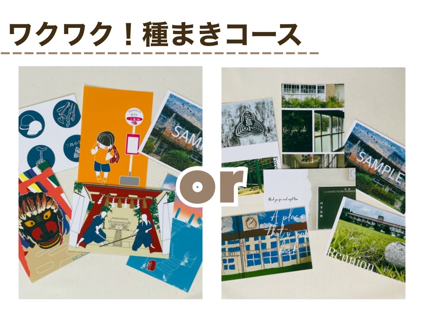 「サクサク!耕すコース」以外の全てのコースには「オリジナルポストカードセット(5枚入り)」が付きます。「オリジナルポストカードセット(5枚)」は、イラスト版と写真版の2種類をご用意しておりますので、お好きな方をお選びいただき、申し込みの際のオプション欄で選択してください。