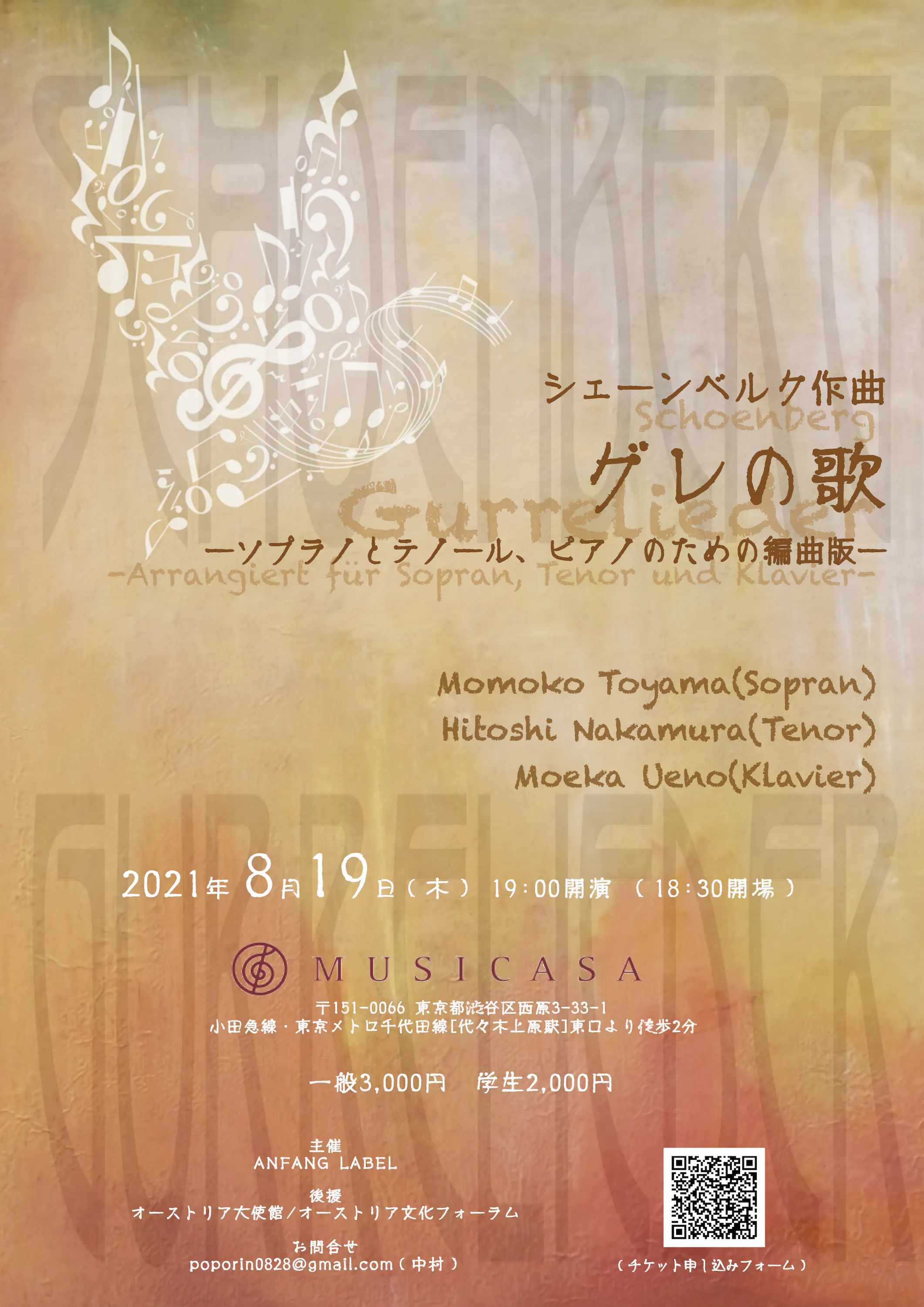 そこで今回、ウィズコロナ時代における新しい芸術活動の取り組みとして、シェーンベルク作曲の『グレの歌』を3人のソリストのために編曲して上演及びDVD販売を行います。この曲はもともとオーケストラに加え5人の声楽ソリストが必要とされますが、今回は感染症対策も含め、出演者3人で演奏を行う運びとなりました。