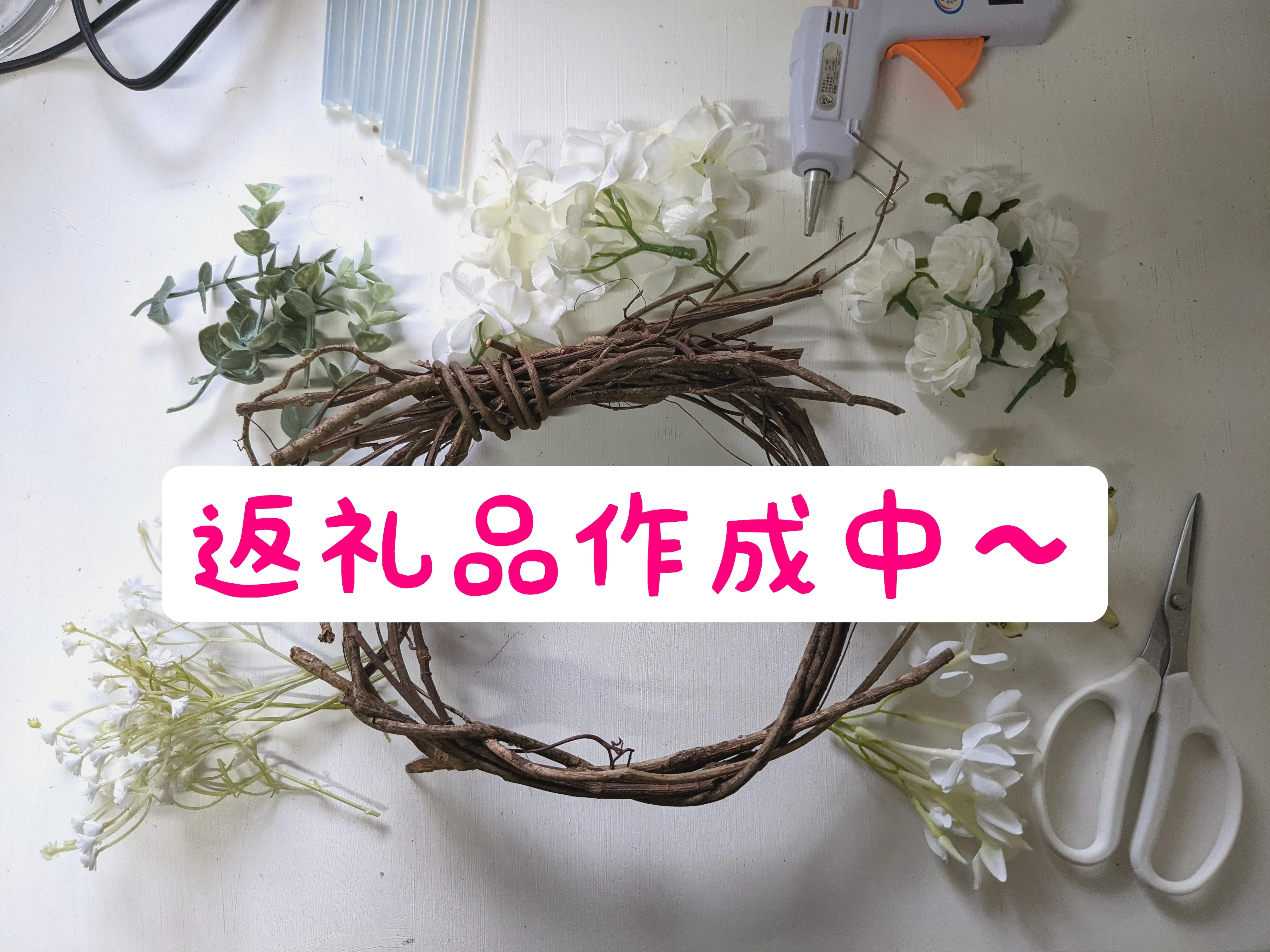 花材がどっさり届いたので、返礼品作りを開始しました!