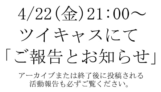 2022/04/18 19:00大変長らくお待たせしてしまい申し訳ありません。4/22(金)21:00~ツイキャスにて現在の状況についてご報告と大切なお知らせをさせて頂きます。重要なお知らせとなりますので、リアルタイムでの視聴が難しい方はアーカイブまたは終了後に投稿されます活動報告を必ずご覧ください。よろしくお願いいたします。(まどり) もっと見る