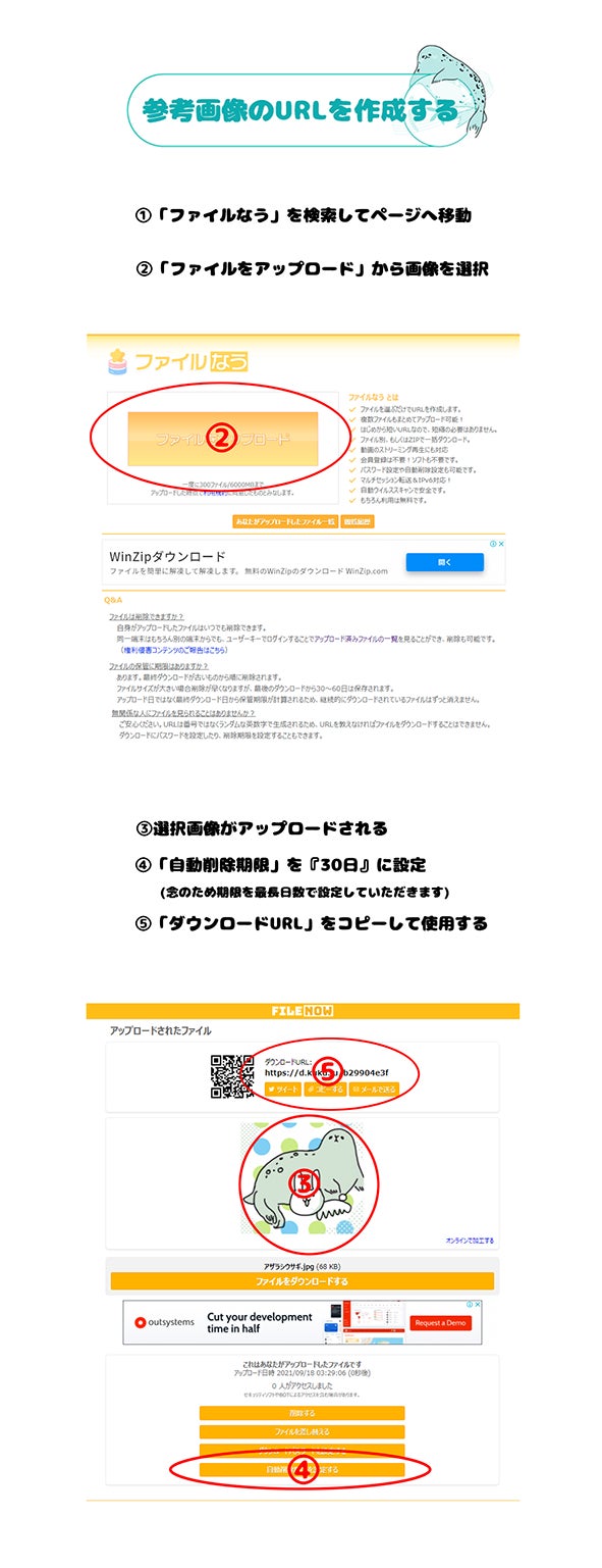 URL作成サイト「ファイルなう」に画像をアップロードしていただき、発行されたURLをフォームにご記入ください。また、必ず「自動削除期限」を『30日』に設定してください。