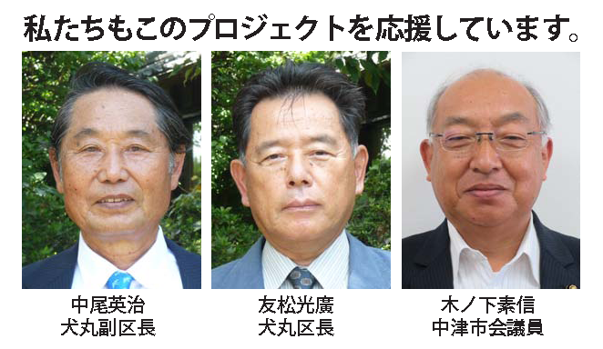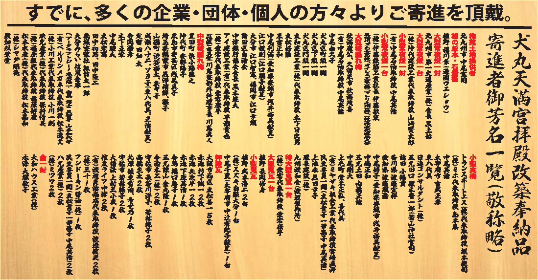 私たちは、犬丸天満宮の氏子・崇敬者による積立金だけでは、拝殿の改築が予算的に困難な状況が発覚後の2018年(平成30)11月25日に発足しました。●活動目的は、社殿や境内各種施設の維持管理と新造の犬丸梅苑のメンテナンスです。またそのための資金集めです。かつては、細川・小笠原・奥平候の歴代中津藩主の庇護の中で栄えた地域の歴史文化遺産を見直し、磨き、PRを行い、観光客誘致による交流人口の増大を図り、観光による地方創生を実行する団体です。●会員構成は、次の犬丸区の役職者とします。①犬丸区の役員:区長・副区長・土木区長の3名、協議員14名、②区内の門・町・下・野路山地区の宮総代4名、老人会役員3名、婦人会会長、民生委員2名、以上の27名を基幹会員とし、高額寄進者を準会員とします。●奉賛会の会長は、提案者の「宮総代長 中尾和正」とします。●これまでの実績/①令和元年と2年の年末に「合格御守」を手作りし、市内予備校の高校・大学受験生や地元中学3年生に無料進呈。②初年度は、太宰府天満宮権禰宜と中津市長を招き、犬丸梅苑の「植樹祭」、次年度はコロナ禍に対応、規模縮小で「プレ梅花祭」を開催。③「協賛奉納品のご案内」三つ折りパンフレットを作成し、立地企業・団体・有志様へ奉納のプロモートを継続中で、7月現在多くの奉納をいただいています。※下図参照