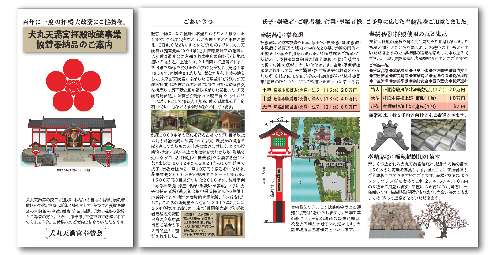 いよいよ10年計画も残り半年足らずとなり、当神社の隣接地に梅苑も完成し、梅の木の奉納も可能になりました。昨年2月には、太宰府天満宮様より紅白梅一対と香梅が恵与され、盛大に植樹祭が開催されました。個人の奉納者様から協賛企業様まで、幅広いリターンアイテムをご用意しました。境内には、歴代中津藩主が毎年参詣し、連歌の催しを開いた江戸期、「西の博多、東の中津」と言われた賑わいの商都でもあった頃の豪商たちが寄進した石燈籠も残っています。犬丸天満宮奉賛会によるPR活動によりマスコミにも度々取り上げられ、参拝客も増えてきています。企業様の広告宣伝ツールやCSRとしてもご活用ください。拝殿改築の暁には祈りの旅、梅見の名所として観光引力強化に励む所存です。