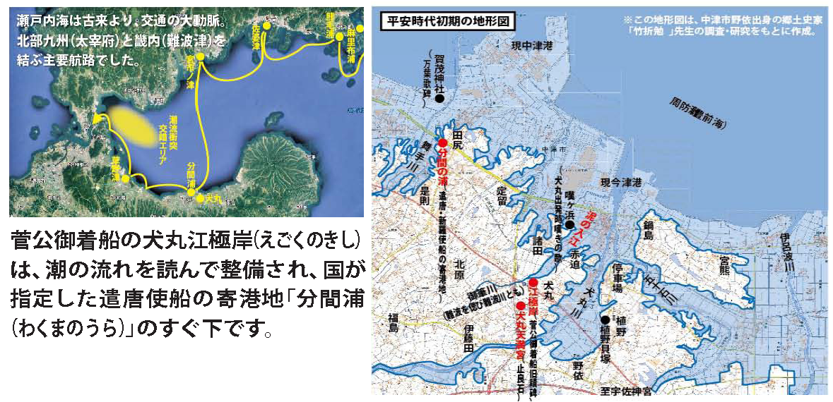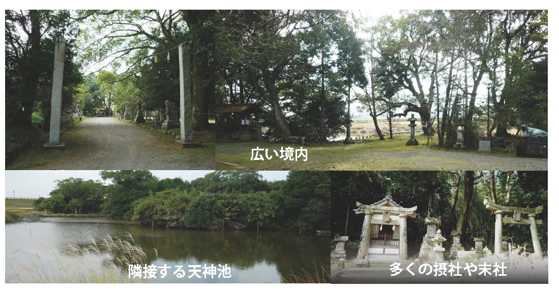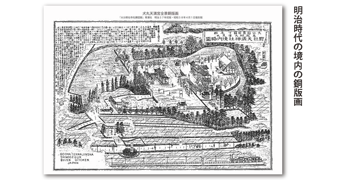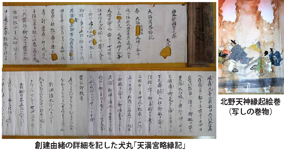 まずは当神社の創建由緒をご紹介します。延喜元年(901)左大臣藤原時平の讒訴により、菅原道真公(菅公)が左遷され大宰府に向かう折に、嵐に遭い犬丸の地に上陸され、21日間もご逗留されました。2年後に大宰府で菅公が亡くなられると、天変地異や都人たちに不幸が続き、菅公の祟りと恐れられました。時の村上天皇は、菅公の旧蹟を改め「天満天神」として祀るよう勅命を下しました。そこで孫の菅原文時公が当地を訪れ、天暦十年(956)犬丸天満宮が創建されました。菅公九州初上陸・ご逗留の地として、貝原益軒が記し太宰府天満宮に奉納した「天満宮古實」にも書かれています。また、当神社に奥平源定登が記し奉納した巻物「(犬丸)天満宮略縁記」には、菅公が詠まれた和歌三首と文時公の和歌や、菅公御腰掛けの「止良石(とらいし)」などが、詳しく紹介されています。