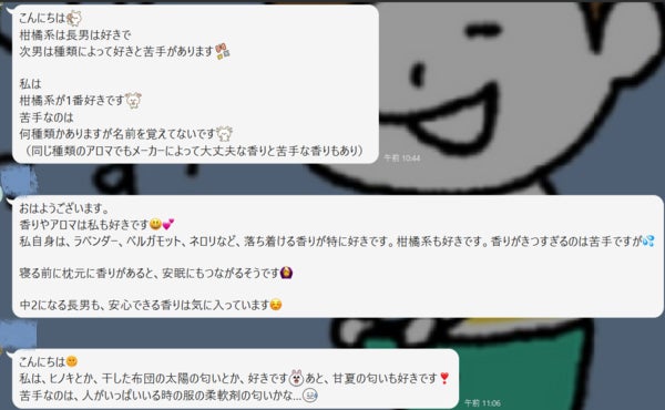 マスクをしていても日常でいろいろな香りを感じますが、好き!だと呼吸も深くなるし脳が整う感じもしてリラックスも出来ます。安心感も湧く香りの商品化に期待しています。(50代女性)