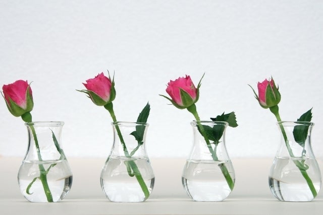 部下たちのデスクの上に、バラの花を添えた小瓶を並べていきましょう。