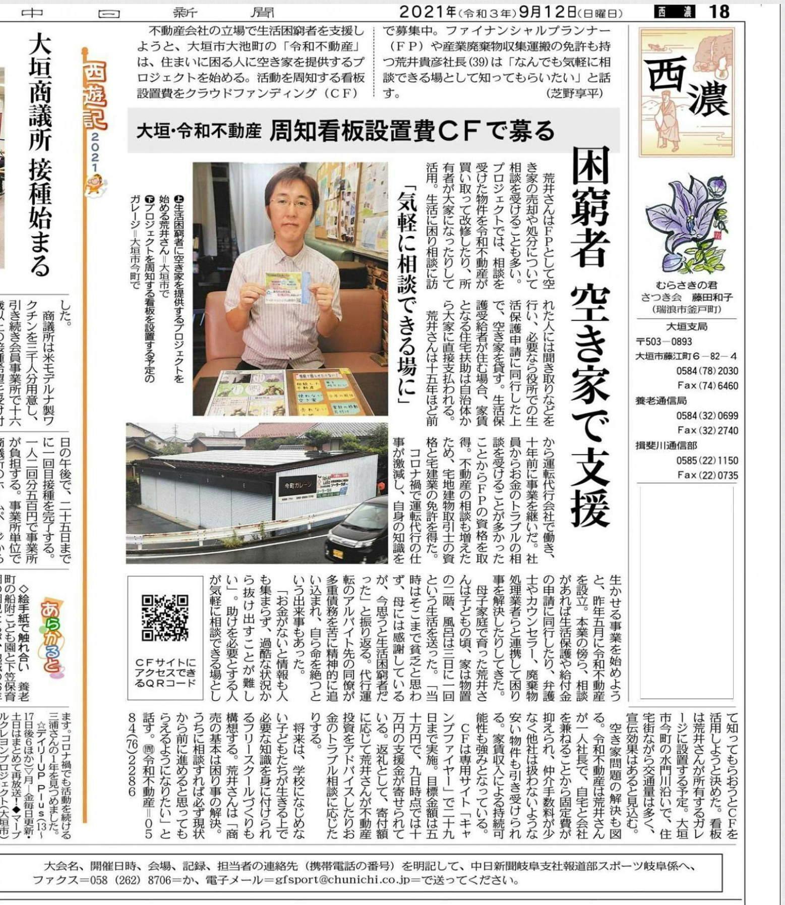 2021年9月12日の私の地元の中日新聞の朝刊で「困窮者 空き家で支援」というタイトルで令和不動産の活動を掲載頂きました。