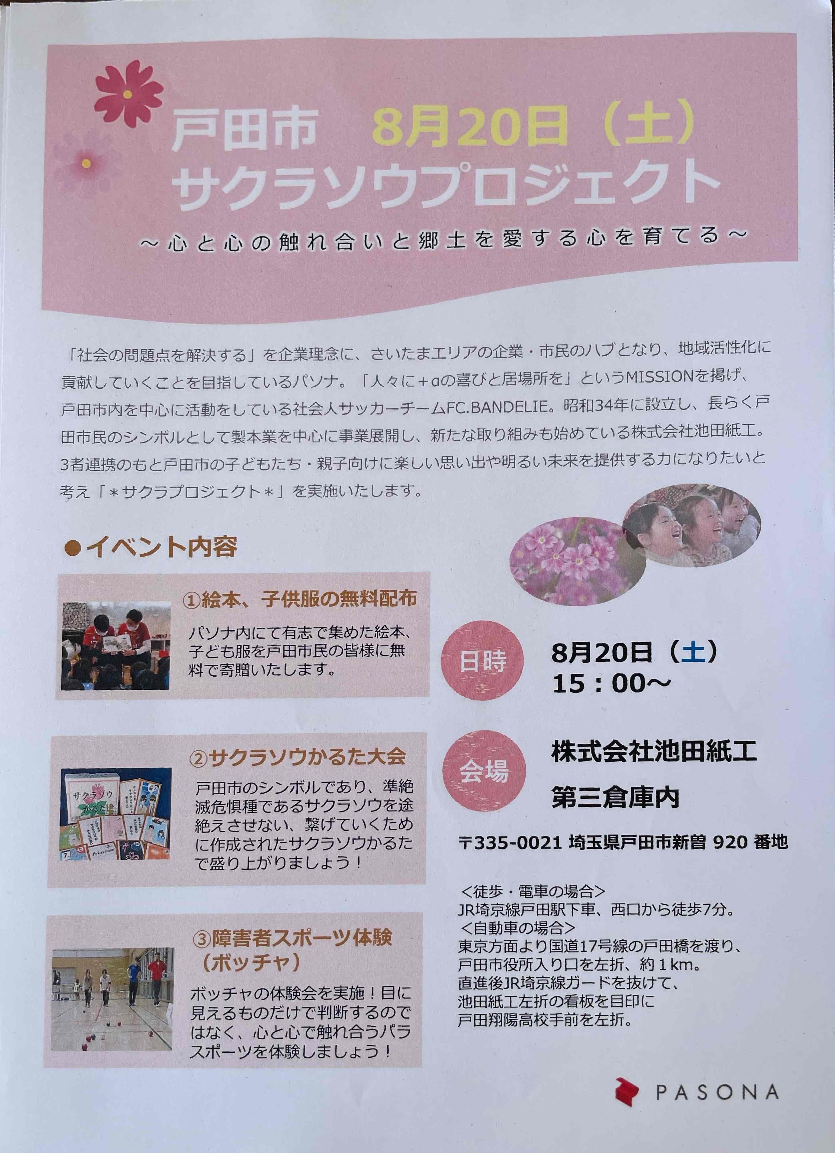 2022/10/27 14:36ご無沙汰しております、サクラソウかるたプロジェクト。季節はすっかり秋めいて、街中の木々が色づいてきました。戸田市の花はご存じのとおりサクラソウですが、戸田市の木であるキンモクセイが今を盛りと市内各地でかぐわしい香りとともに咲き誇っています。例年と違わず暑かった夏が嘘のように朝晩は寒いくらいですが、かつての猛暑のさなかに開催された株式会社パソナ主催の「サクラソウプロジェクト」に参加してきましたので、遅ればせながらご報告させていただきます。ちなみに「サクラソウプロジェクト」とは…”社会の問題点を解決する”という企業理念を掲げるパソナグループとともに、戸田市内の社会人サッカーチームFC.BANDELIEと、市内でも有数の製本業を営む株式会社池田紙工の三者が連携し、地域の子どもたちの明るく健やかな成長のために貢献していくプロジェクト。そもそも戸田市内で同じ「サクラソウ」の名を冠したプロジェクトであり、社会貢献と地域活性化という共通の想いに触発されて、パソナのご担当者に突撃連絡してご縁を結ばせていただき、今年で第三回目となる同プロジェクトに我らが「サクラソウ”かるた”プロジェクト」も参加させていただくことになりました。去る8月某日。池田紙工さんの倉庫をお借りし、絵本と子供服の無料配布、障害者のスポーツ体験(ボッチャ)、そしてサクラソウかるた大会を実施。当日はあいにくの空模様でしたが、近隣の方々を始め関係者の友人・知人や通りすがりの人々など、多くの方にお越しいただきました。近所にお住いの方々。初めてのボッチャに興味津々。FC.BANDELIE の皆さまとともに楽しそうにご参加くださいました。私もかるたの読み手として参加しましたが、読み上げ連続5回目にして声がかすれてきました…来年はボイトレが必要そうです。。。これは当日の準備中の画像ですが、広い倉庫内にパソナグループ社内にてたくさん集まった子供服や絵本が、所狭しと並べられていました。当日の活動について、パソナグループのHPにも記載されています。https://www.pasonagroup.co.jp/koken/activities/article.html?itemid=4463&dispmid=2378コロナ禍でイベントも思うようにできないこともありましたが、ようやくこうした活動も徐々に行えるようになってきました。地道な草の根運動がやがて地域に根差して大きな花を咲かせていけるよう、今後も活動を続けてまいりますので、引き続きよろしくお願いいたします。 もっと見る活動報告⑤戸田市役所に寄贈してきました!その2
