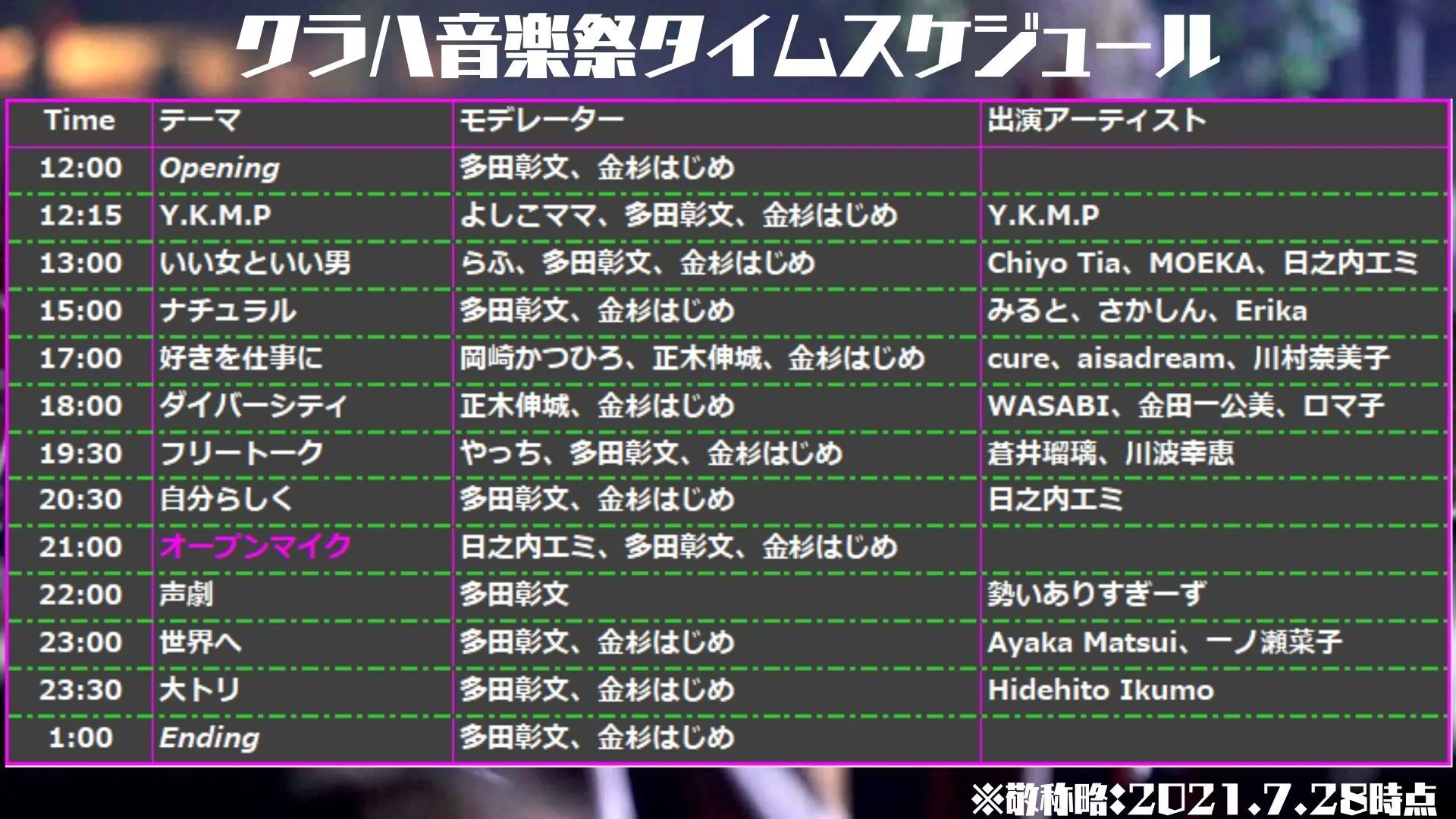 先日2021年7月31日12:00から翌8月1日の1:30過ぎまで13時間以上ぶっ通しの「クラハ音楽祭2021SUMMER」は大盛況の中終えることができました。
