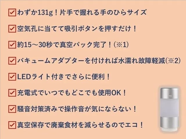 ※1) 使用する専用バッグの大きさや、パックする内容物の容量により真空時間は異なります。