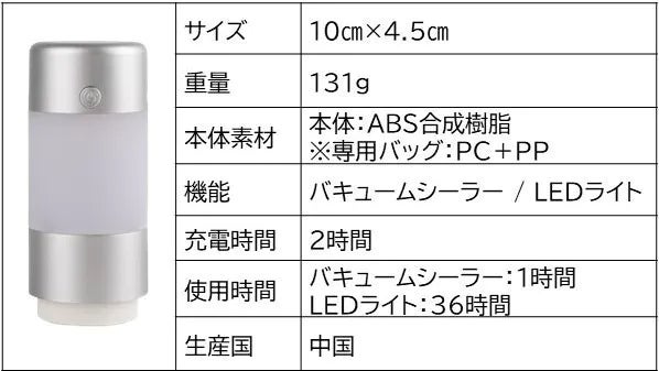 バキュームシーラー:2時間でフル充電、1時間連続使用可能です。
