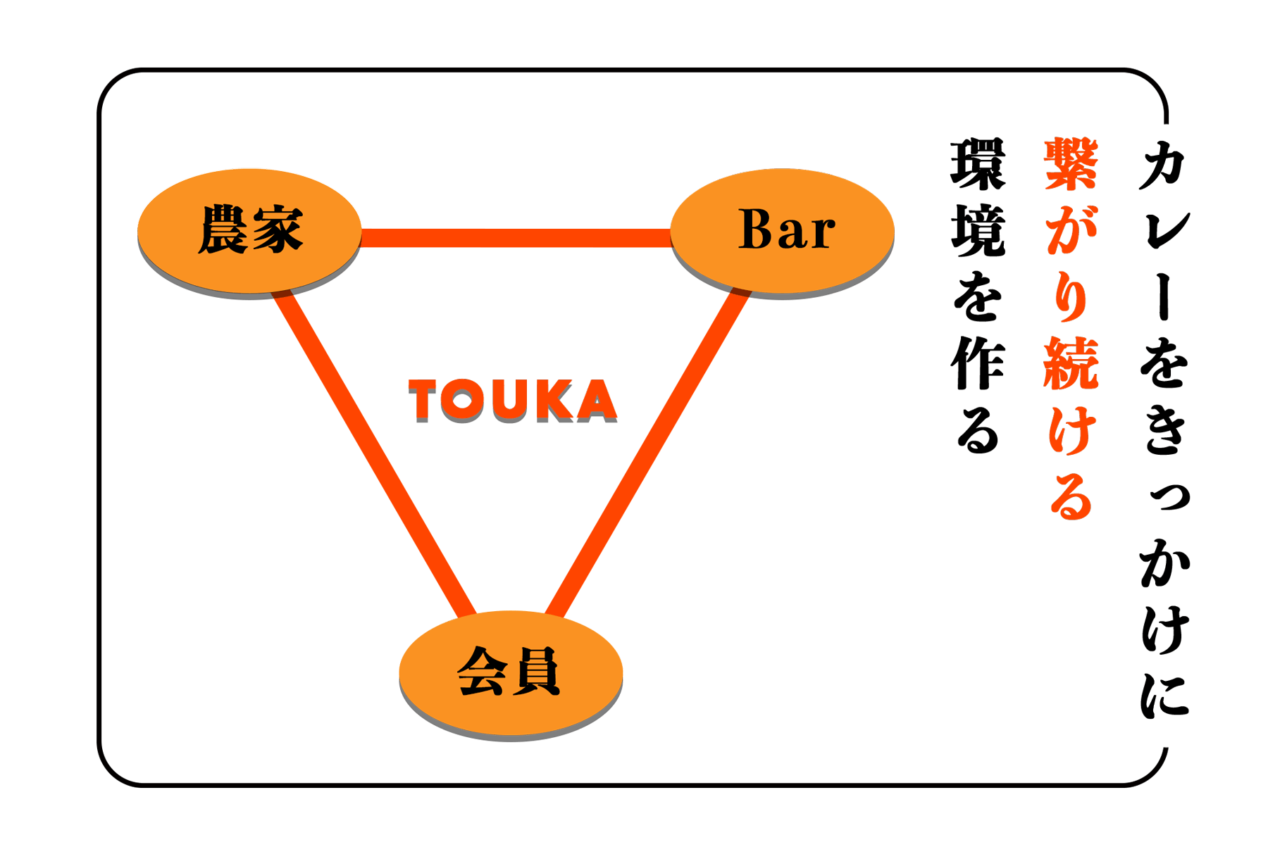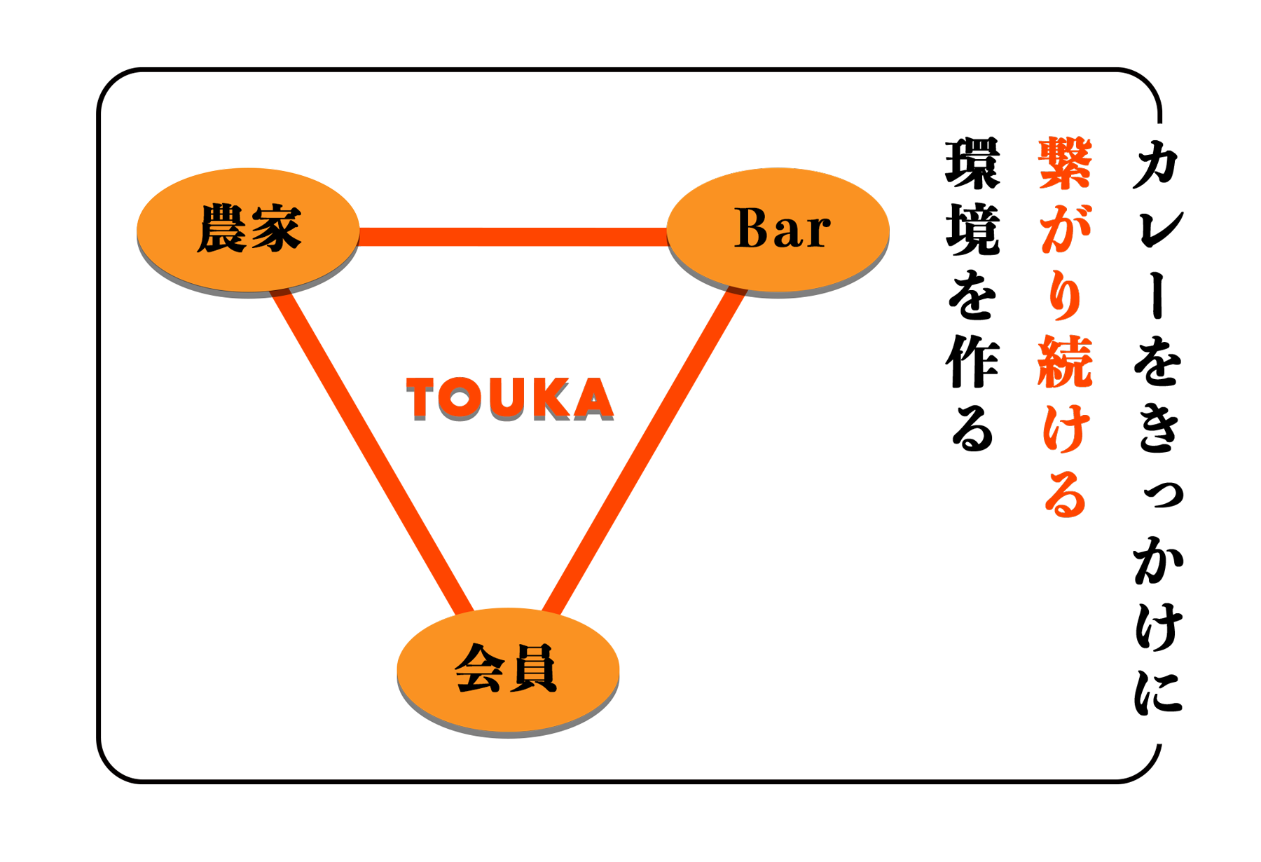 例えば、TOUKA会員であれば直接農家の方に野菜を買いつけたり、バーでイベントをしたり、ご家族を連れて農業体験ができたりなど、カレーを食べるだけに止まらずその後も繋がり続けられるように行動していきます。