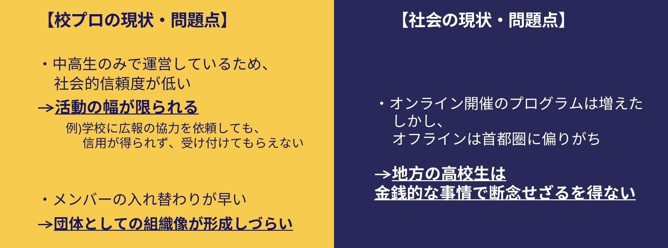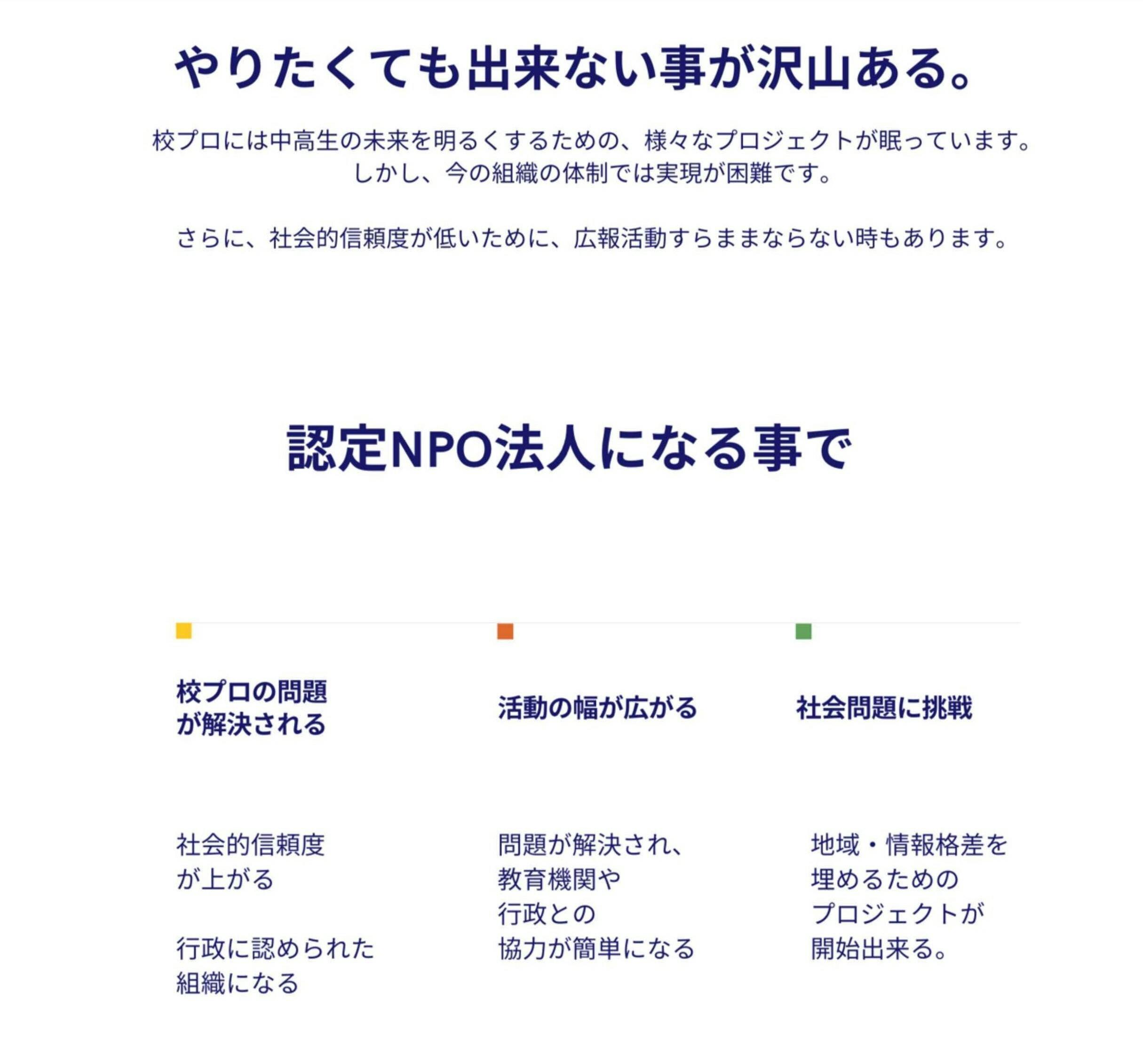 まとめると、認定NPO法人になれば、校プロが今抱えている問題を解決でき、活動の幅も広がります。その結果、校プロが社会問題に挑戦しやすくなると言えます。