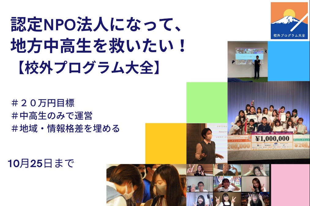 2024/03/29 17:01校外プログラム大全 NPO法人化担当 島﨑みちほです。プロジェクトの進捗状況をご報告します。・NPO法人化についてこの度、校外プログラム大全は東京都からNPO法人として認可され、2024年3月26日付けで「NPO法人校外プログラム大全」を設立いたしました。支援者の方々並びにプロジェクトを応援してくださっている皆さま。皆さまからのご支援・応援がなければNPO法人化を達成することはできませんでした。メンバー一同深く感謝しております。そして、当初のNPO法人設立予定よりも大幅に遅れてのプロジェクト完了となってしまったこと、心よりお詫び申し上げます。誠に申し訳ございませんでした。NPO法人としての活動方針や新規プロジェクトなどについては、詳細が決まり次第このプロジェクトページもしくは校外プログラム大全公式サイトにて発表・ご報告させていただきます。・リターンの履行について支援者の皆さまへのリターンは2022年中に完了しております。リターンを受け取っていない支援者の方がいらっしゃいましたら、大変お手数をおかけしますが、tellprograms@gmail.comまでご連絡ください。・最後にあらためて、支援者の皆さまをはじめとするこのプロジェクトに関わってくださった全ての方に厚くお礼を申し上げます。本当にありがとうございました。また、プロジェクトの進捗報告の滞り、リターンの履行・プロジェクト完了の遅延など、支援者の皆さまには多大なるご迷惑とご心配をおかけしてしまったこと、重ねてお詫び申し上げます。NPO法人校外プログラム大全は団体の活動目標の一つである教育格差の是正を目指し、これからさまざまな活動を行っていく予定です。皆さまからの期待に応え、いただいたご支援に恩返しできるよう鋭意取り組んで参りますので、これからも校外プログラム大全を見守っていただけると幸いです。 もっと見る