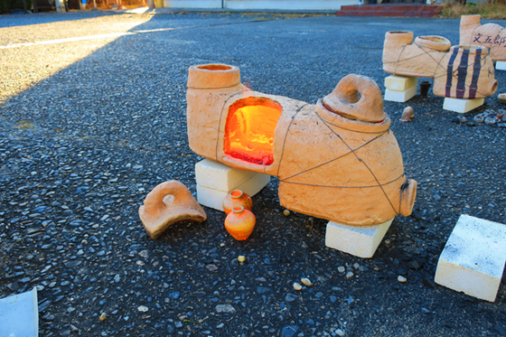 その対策として、熱のこもった窯の下にまずは避難させます。写真の陶器はまだ高温によって光っているのが分かると思いますが、このまま一時間も冷やせば持つことも可能になります。