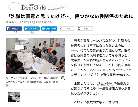 若者が集うキャンパスなどで、性暴力の被害者にも加害者にもならないように――。そのために必要な知識として、性における同意の大切さを知ってもらおうと、大学生らが来春の新入生向けにハンドブック作りを企画している。150万円を目標に、インターネットを通じたクラウドファンディング(CF)で資金集めを始めた。