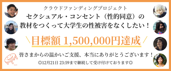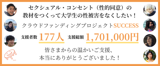 12月21日をもって、「セクシュアル・コンセント(性的同意)の教材をつくって大学生の性被害をなくしたい!」のクラウドファンディングが無事終了いたしました。 この度は、目標の150万円を大きく上回る、1,701,000円ものご支援をいただくことができました。ご支援者数は177人にものぼり、こんなにもたくさんの方々からご支援をいただけたこと、心から感謝しております。 頂いた資金は、セクシュアル・コンセント・ハンドブックの制作・配布のために大切に使わせていただきます。また目標額を超えていただいた頂いたご支援については、ハンドブックの配布数・配布先を当初の予定よりも広げるために使わせていただきます。 先日プロジェクトメンバーでキックオフミーティングを実施し、ハンドブックの枠組みを話し合いました。 ◎キックオフミーティングの様子は、こちらからご覧いただけます→ https://camp-fire.jp/updates/view/43163 大学生に同意の大切さを知ってもらうためにはどのような知識をどう届けるべきか、様々なアイディアがでました。来年4月の新学期に多くの大学生に配れるよう、これから約3ヶ月かけて、、これらのアイディアを形にしていきます。 ご支援をいただいた皆さま、拡散・シェア等を通してご協力くださった皆さまには、重ねて心からお礼を申しあげます。 性暴力の被害者も加害者もうまない社会に向けて、自分も相手も大切にできる豊かな人間関係が広がる社会に向けて、皆さまのおかげで大きな一歩を踏み出せること、大変嬉しく思います。 本当にありがとうございました。