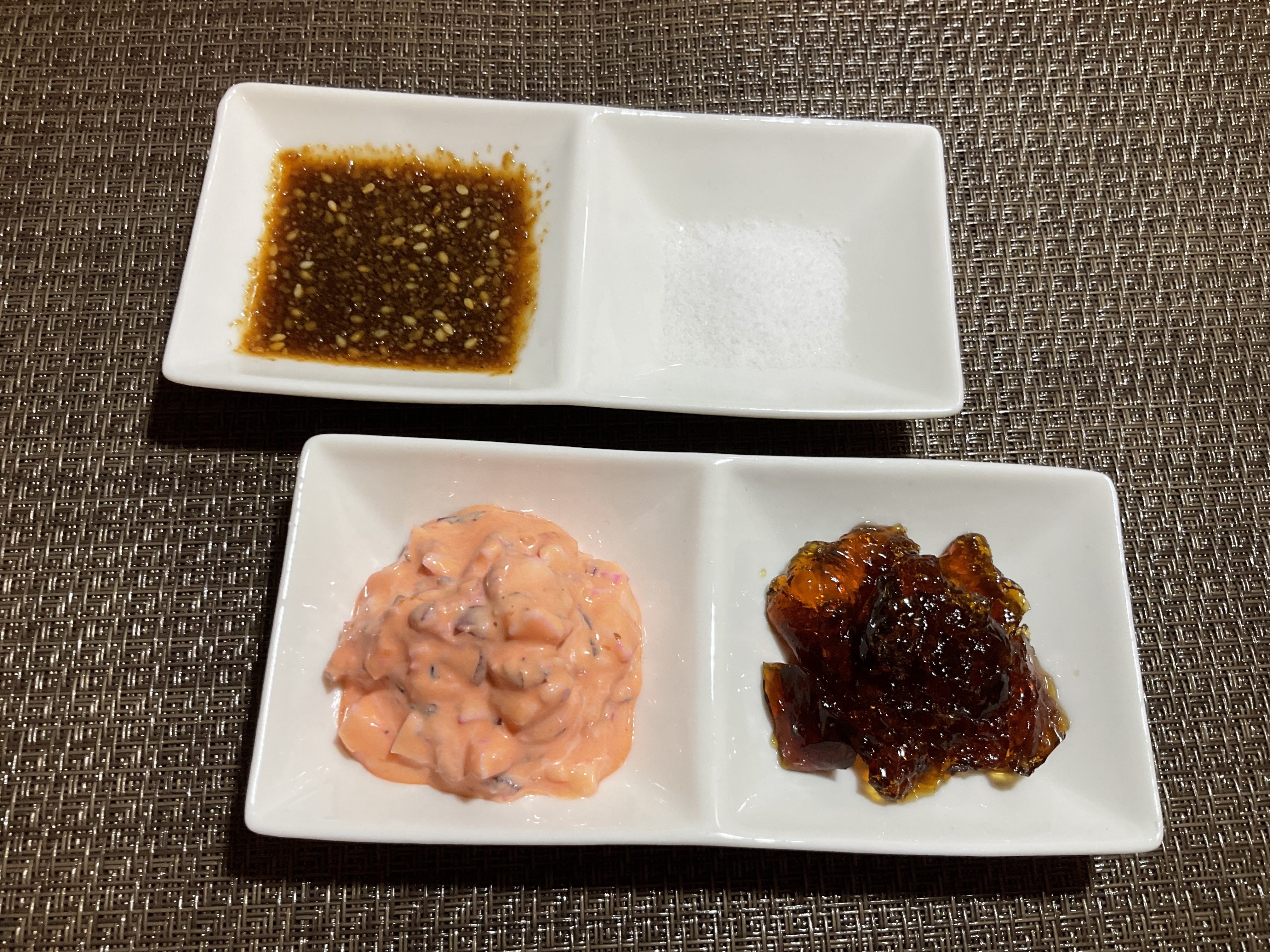 左上からごまソース、塩、しば漬けタルタルソース、ポン酢