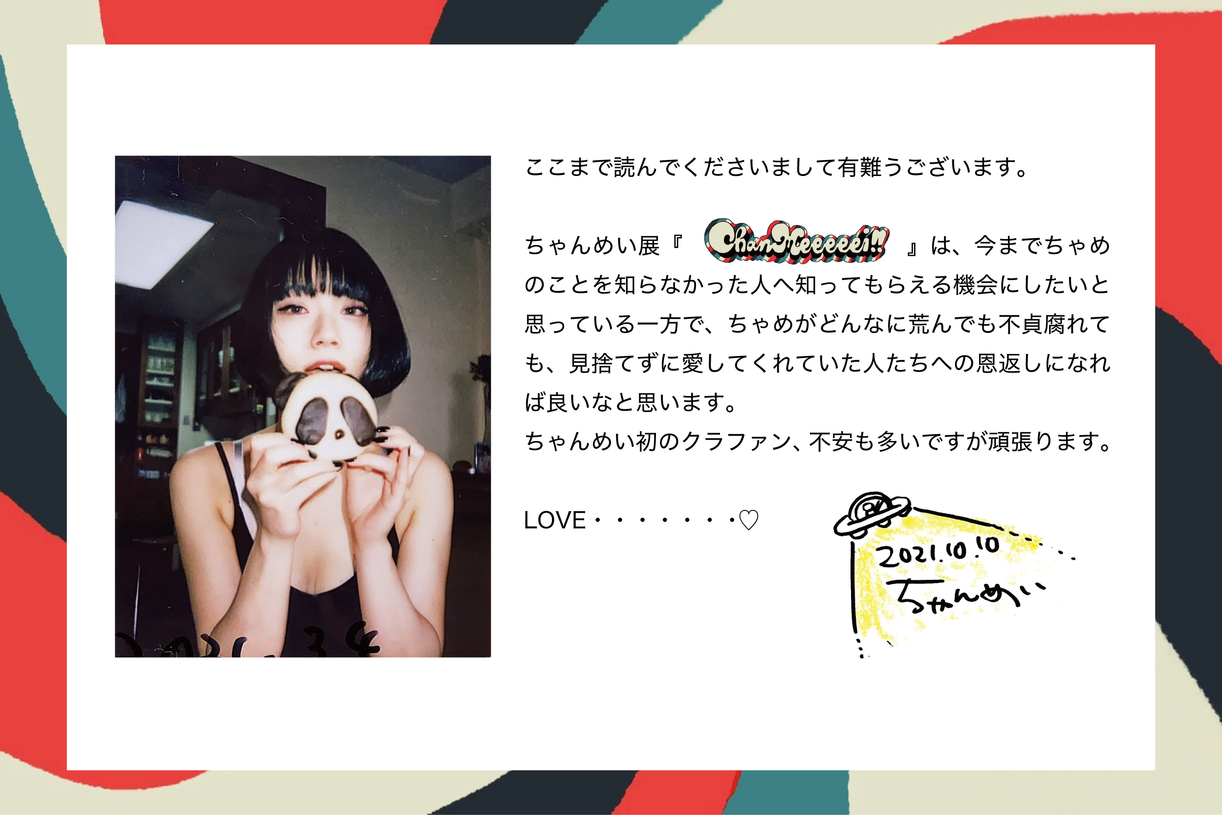 また、突然ツイッターに投稿されるちゃんめいのイラストや漫画(ちゃめコマ)にはありがたいことに多くのメッセージやloveを受け取っており、コアなファンがいるもんだな〜と感じております💓